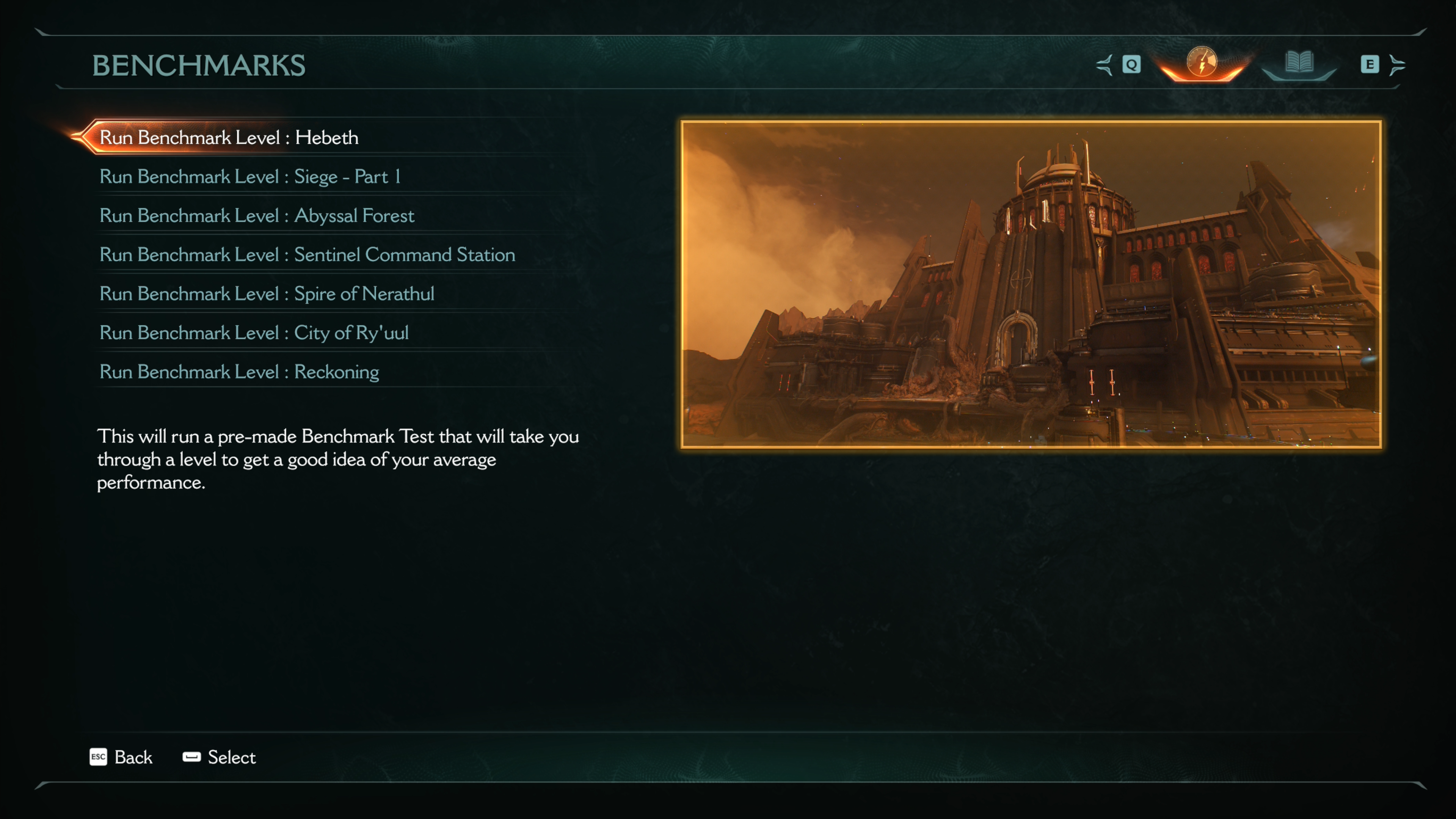 There are seven in-game benchmark scenes in total, Hebeth, Siege, Abyssal Forest, Sentinel Command Station, Spire of Nerathul, City of Ry'uul and Reckoning. Benchmark mode creates a consistent, nearly deterministic path through a section of select DOOM: The Dark Ages levels to that players can see how their systems perform under a variety of video settings. Using this mode players can see how far they can push their system performance.