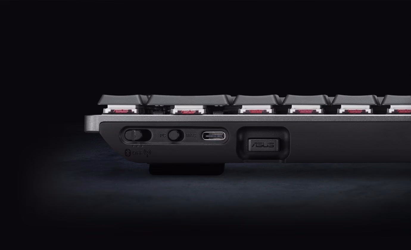 Connectivity-wise, the keyboard supports tri-mode connectivity for up to 5 devices simultaneously via 2.4 GHz wireless, Bluetooth, and USB-C. To further enhance functionality, Asus has included a dedicated PC/Mac toggle switch and integrated storage for the wireless dongle in its injection-moulded plastic base. The device is powered by a 4,000 mAh battery, which the company claims can last 16 months on a single charge with the backlighting disabled, or around 100 days with the RGB running at full brightness.