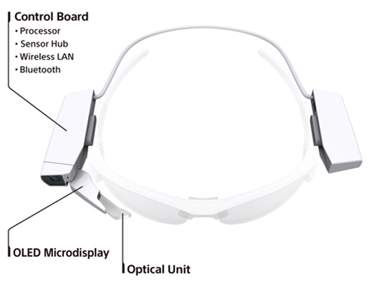 The SmartEyeglass Attach! Device from Sony is based on ARM Cortex-A7 low-power processor and features electronic compass, accelerometer, touch sensor, Bluetooth 3.0, 802.11b/g/n Wi-Fi, 400mAh batter, unknown amount of NAND flash storage and RAM as well as other components, such as various advanced power ICs. The device with the display weighs approximately 40 grams, but has functionality akin to that of low-cost smartphones.