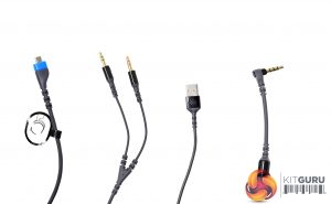 Within the box comes a variety of cables that enable the Arctis 3 to connect to a variety of devices. From left to right, we have 1x main cable that plugs into the headset and connects to both the 3.5mm headphone jack and the dual 3.5mm extension cable; x1 dual 3.5mm extension cable to enable both the headphones and microphone to work on PC; x1 standalone charging cable to enable its wireless Bluetooth feature; and x1 3.5mm headphone jack to connect to any device with a 3.5mm jack.