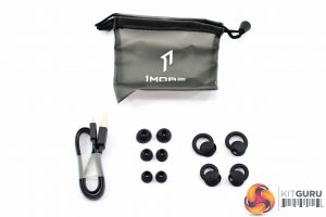 Before getting to that, though, it is also worth touching on the included accessories that are also in the box. These consist of a microUSB charging cable and small carry bag, along with three pairs of silicon ear tips, and another two pairs of silicon ear hooks. There's already a pair of tips and hooks attached to the earphones, as we see below, giving a total of four pairs of tips and three pairs of ear hooks in the box.