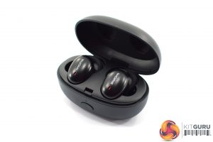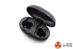 Pressing the button on the front of the case reveals the inside, which is essentially two cut-outs for the earphones to sit in. They slot in perfectly and there is also a slight magnetic attraction to help guide the earphones into place to ensure they charge correctly when inserted.