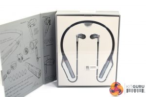 The lid of the box lifts off to reveal the earphones and neckband safely stored in a protective container.