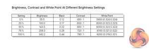 - A monitor’s contrast ratio at various brightness levels in the OSD.