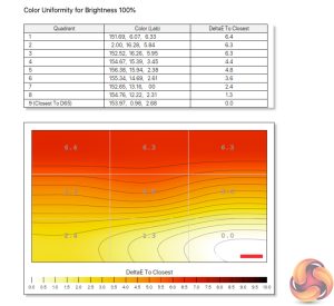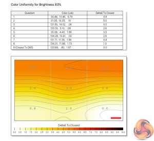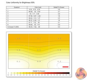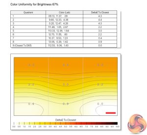 Colour uniformity is a bit more troubling, at least when using the display at maximum brightness, as the top of the panel shows a fair about of deviation. Thankfully, I didn't notice this while gaming, and I tended to use the screen at 80% brightness anyway, where the aberration is less pronounced.
