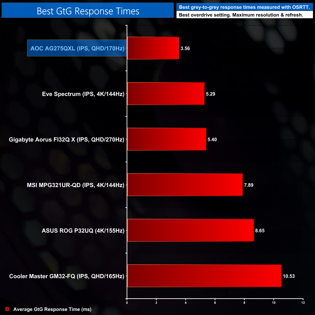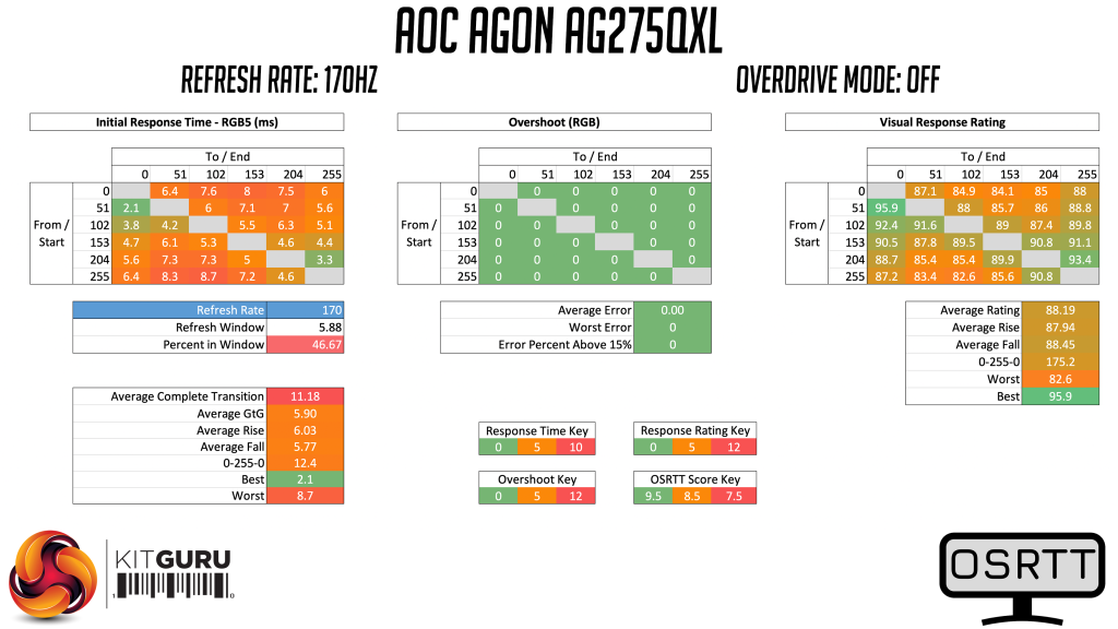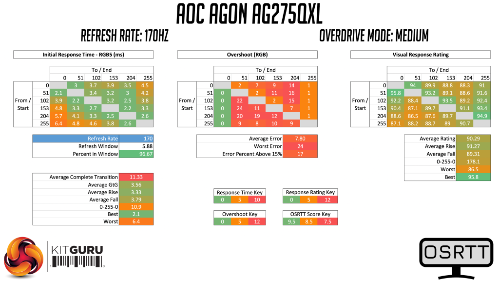 As we can see, of the six monitors we’ve tested with OSRTT, the AG275QXL is the fastest of the lot, with its average grey-to-grey response time of 3.56ms. This is obviously a far from comprehensive list, as I have plenty more screens to test, but this is still a very impressive aspect of the AOC screen.
