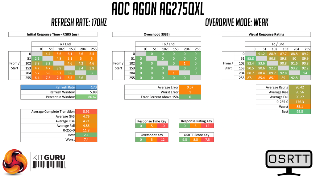 We test the AG275QXL at 170Hz, using all four of the overdrive settings found within the OSD – off, weak, medium, strong.