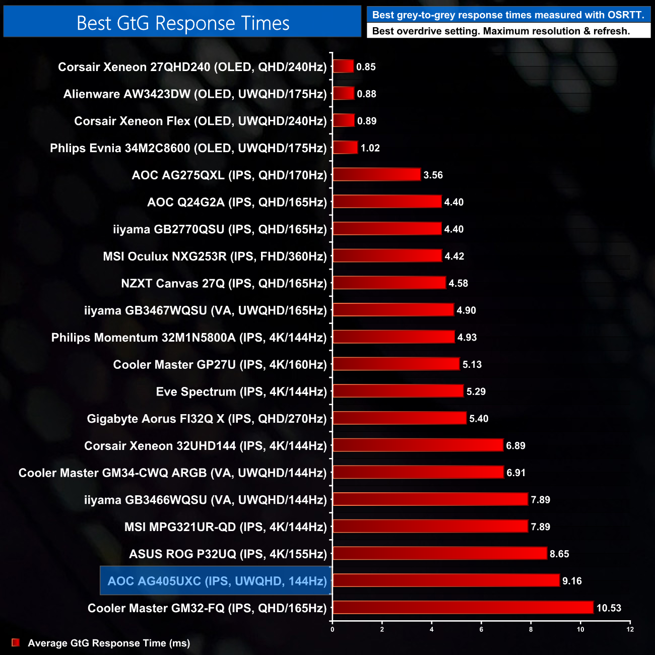 Looking at the best result in comparison to a couple dozen other monitors we've tested, the AG405UXC is one of the slowest we've tested. It's only faster than the Cooler Master GM32-FQ, putting it right towards the bottom of our chart.