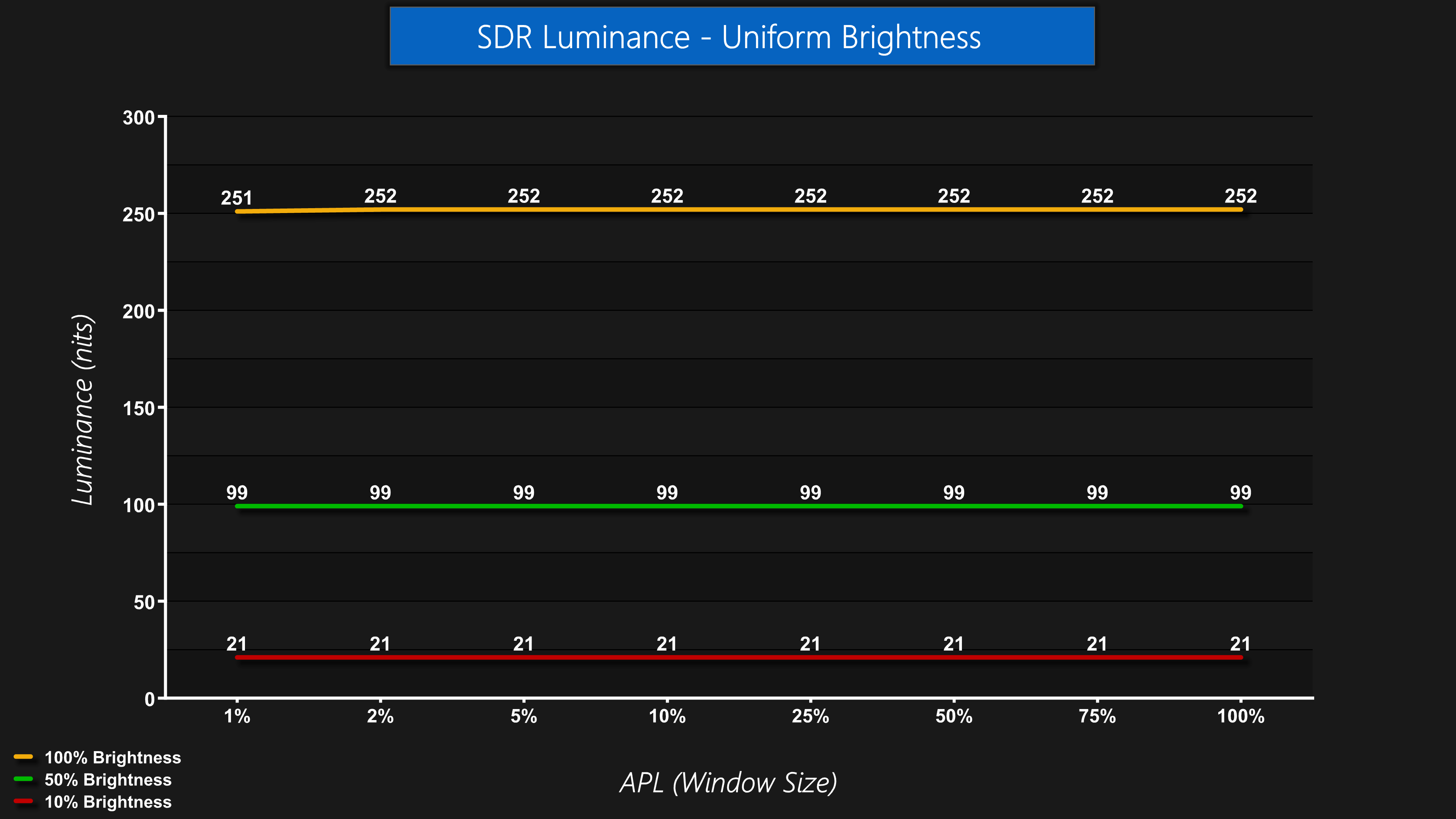 Starting our testing with full screen brightness results, we see a peak of 254 nits at 100% brightness, but then an incredibly low result with brightness at 0% – with our reading of just 1 nit! That itself may be too dim to be usable, but it's great that you can effectively make this screen as dim as you like with no limitation.