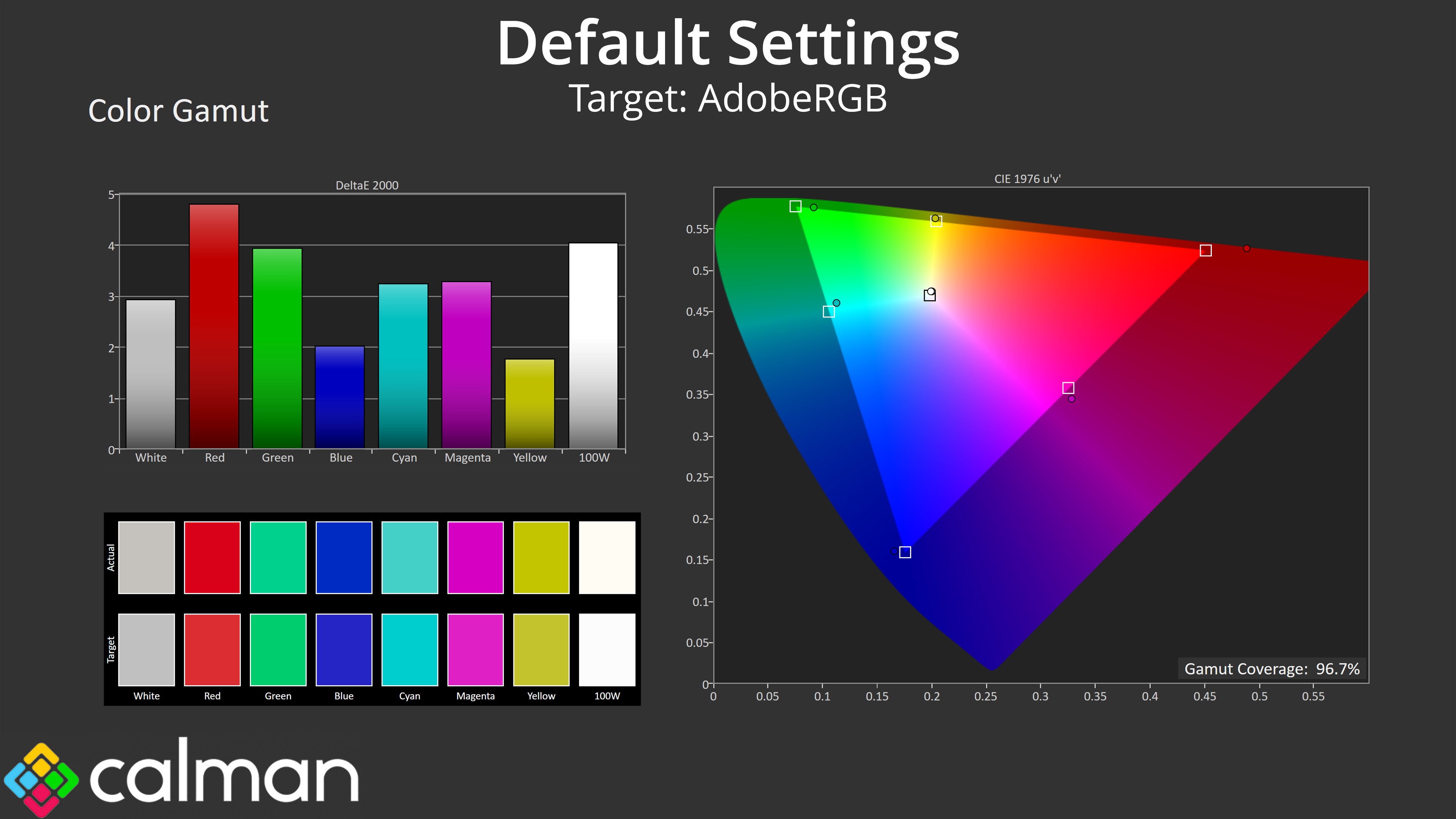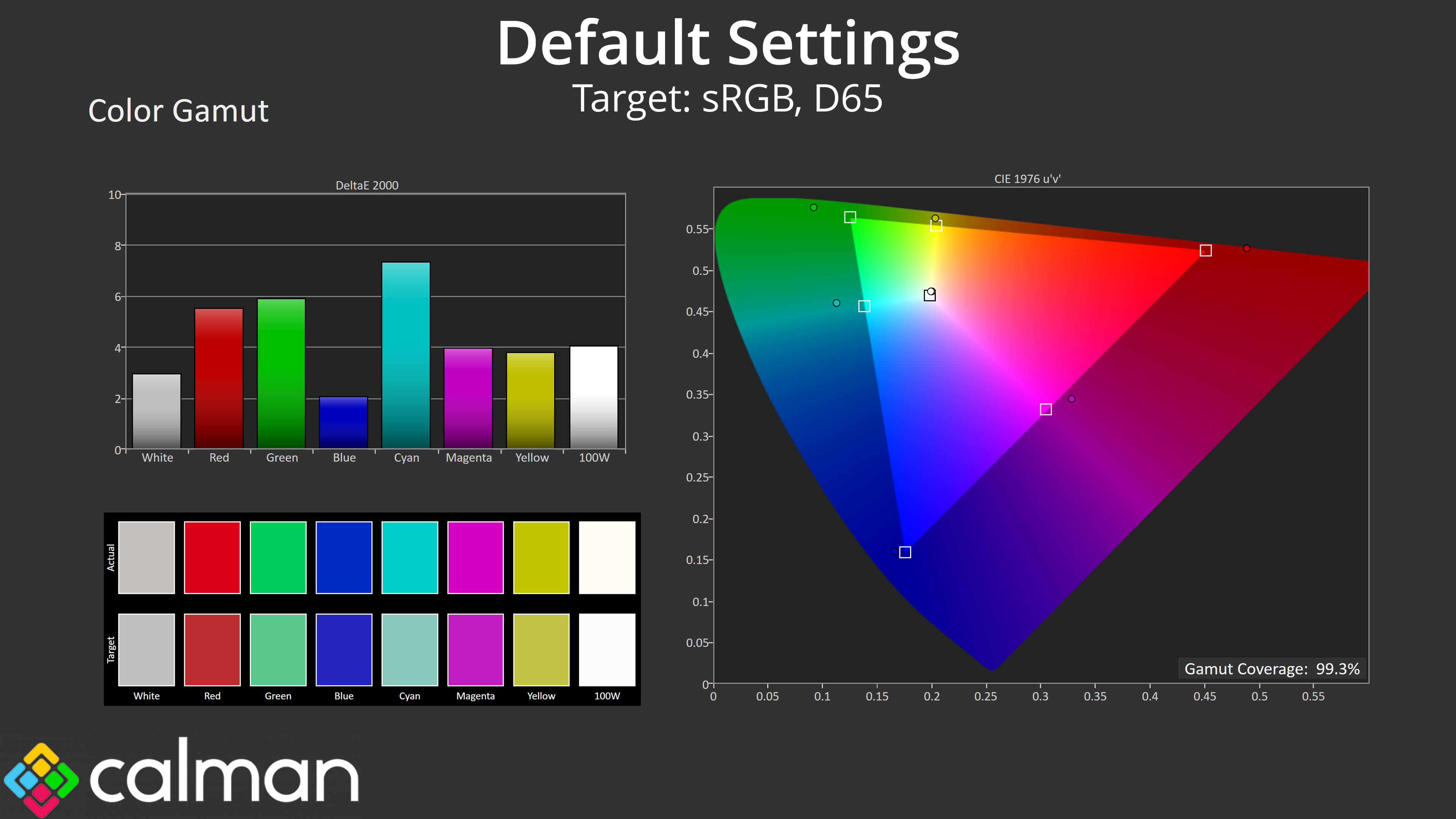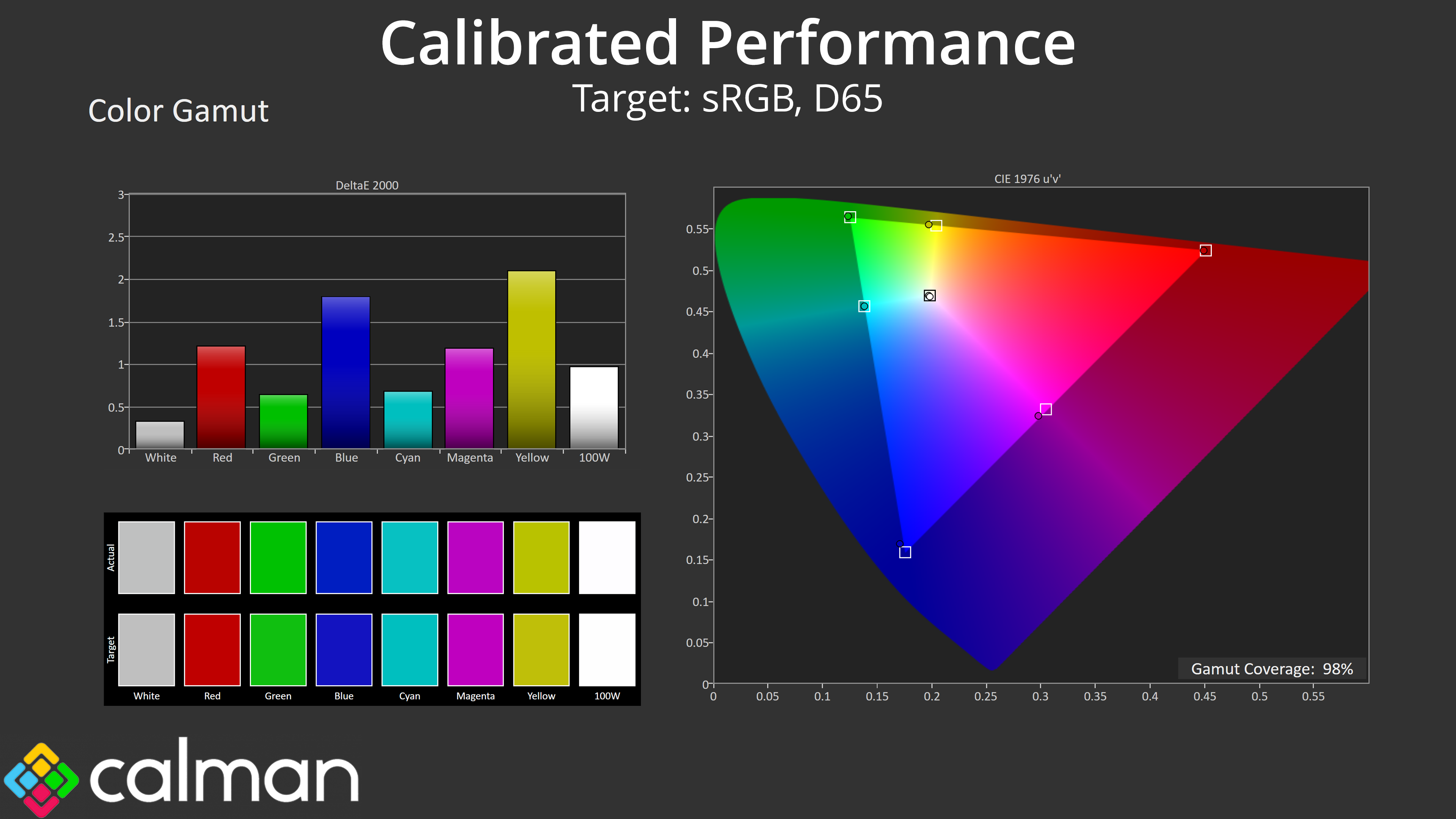 It's no surprise that we get great results when calibration using Calman Ultimate. Gamut locks in much better than what we saw from the sRGB emulation model and greyscale is pretty much flawless, with super gamma tracking too. Saturation inaccuracy is almost completely removed, with a new average deltaE of 0.92, while colour accuracy is also improved with a new average dE 2000 of 1.41.