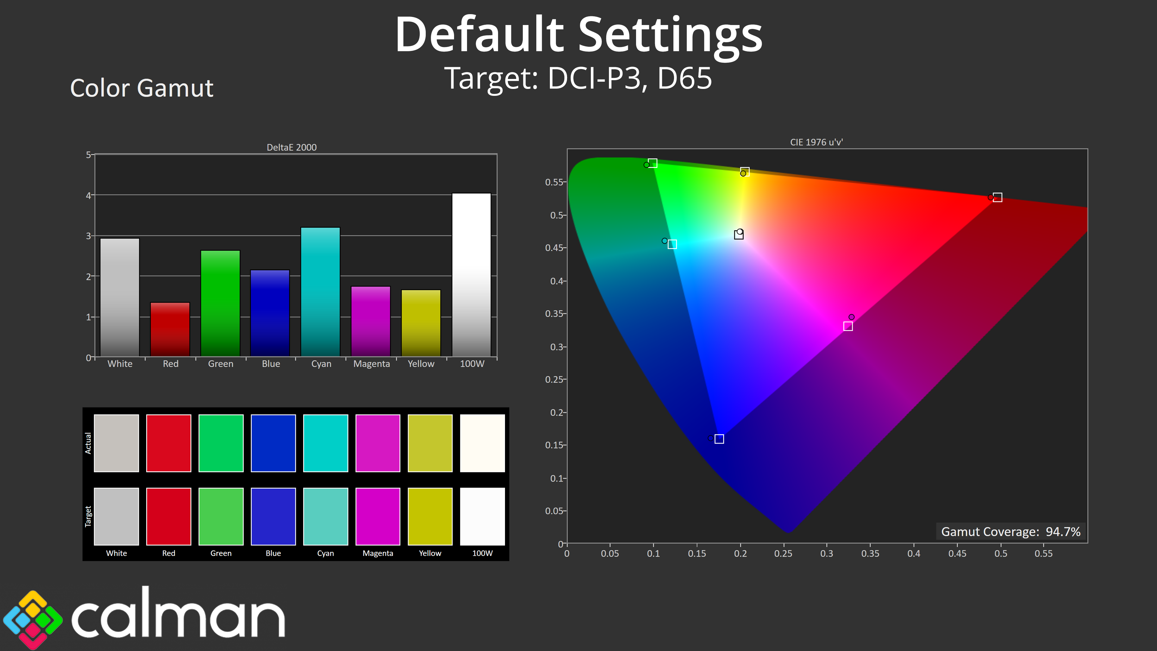 When comparing to the DCI-P3 colour space however, the results are significantly improved, with an average dE 2000 of just 1.46.