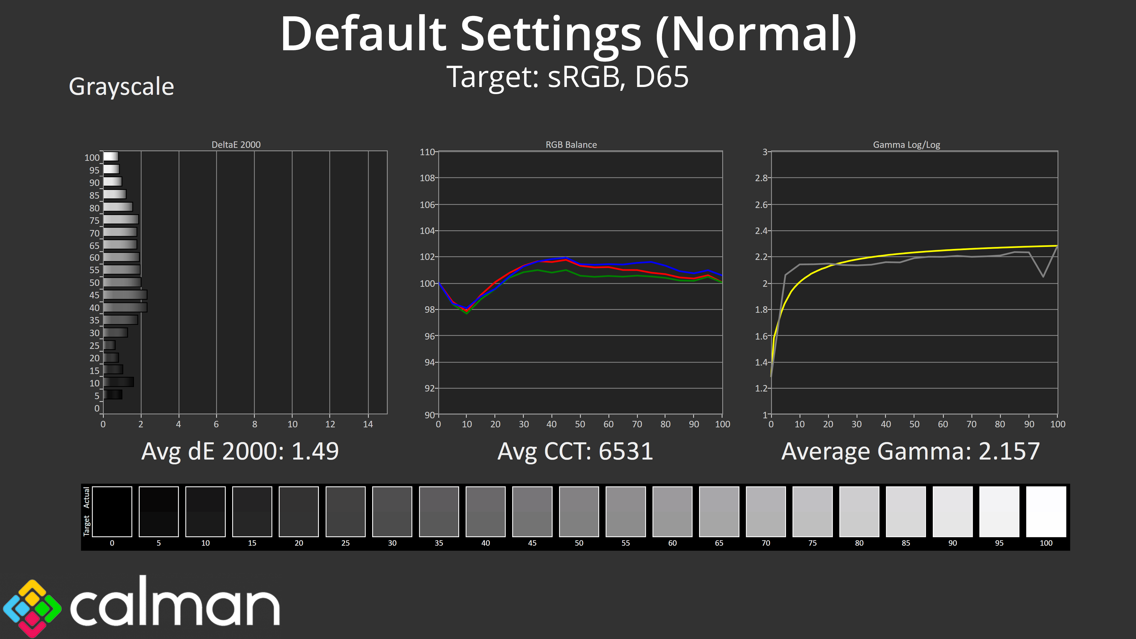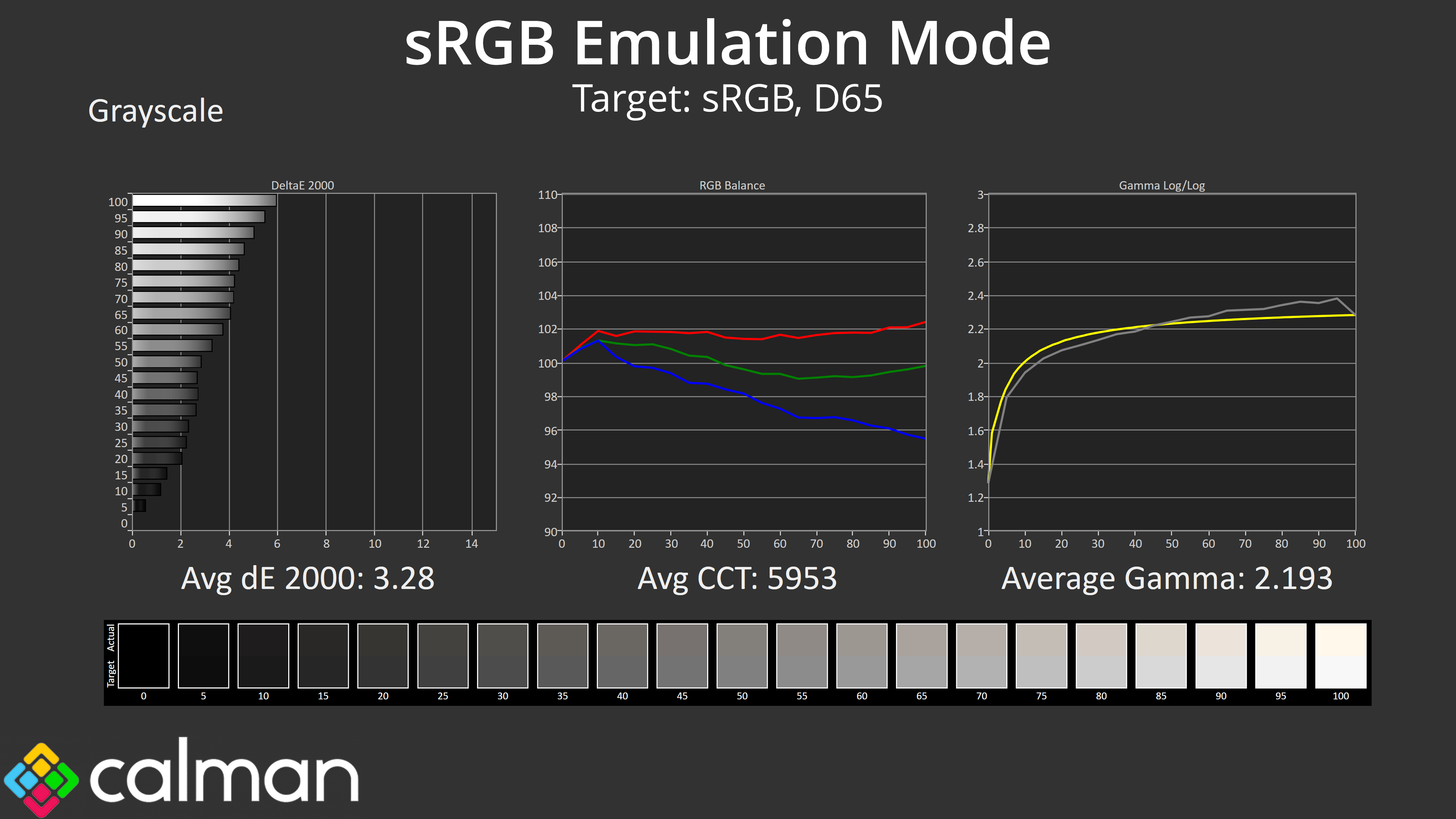 - Greyscale accuracy, measured across 20 shades, with an average colour balance reported.