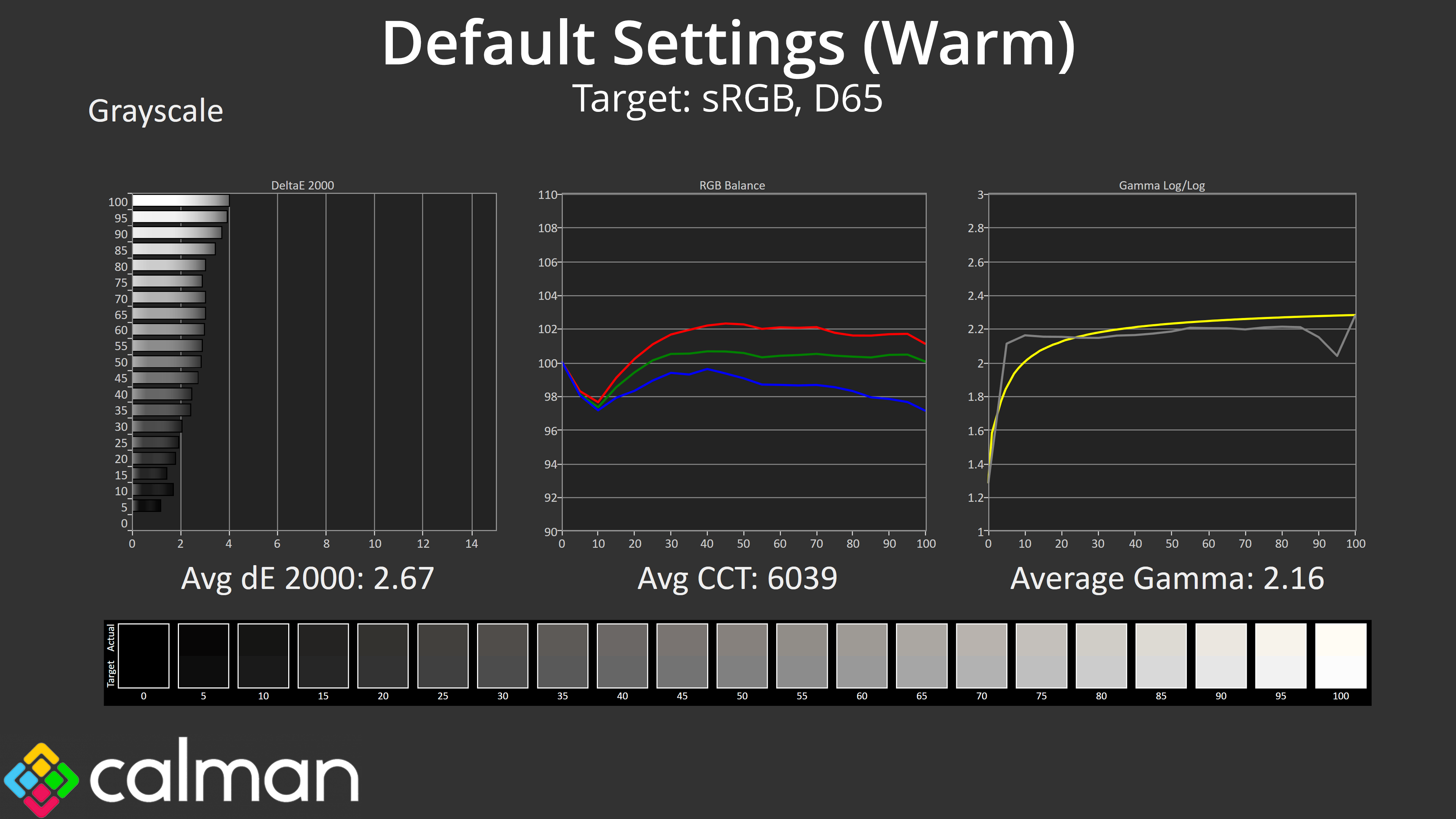 Moving onto greyscale testing, at first I used completely default settings, which for some reason means using the AG276QZD's ‘Warm' colour balance mode. As we can see here, this does indeed product a warm colour balance, with an average CCT (Correlated Colour Temperature) of 6039K.