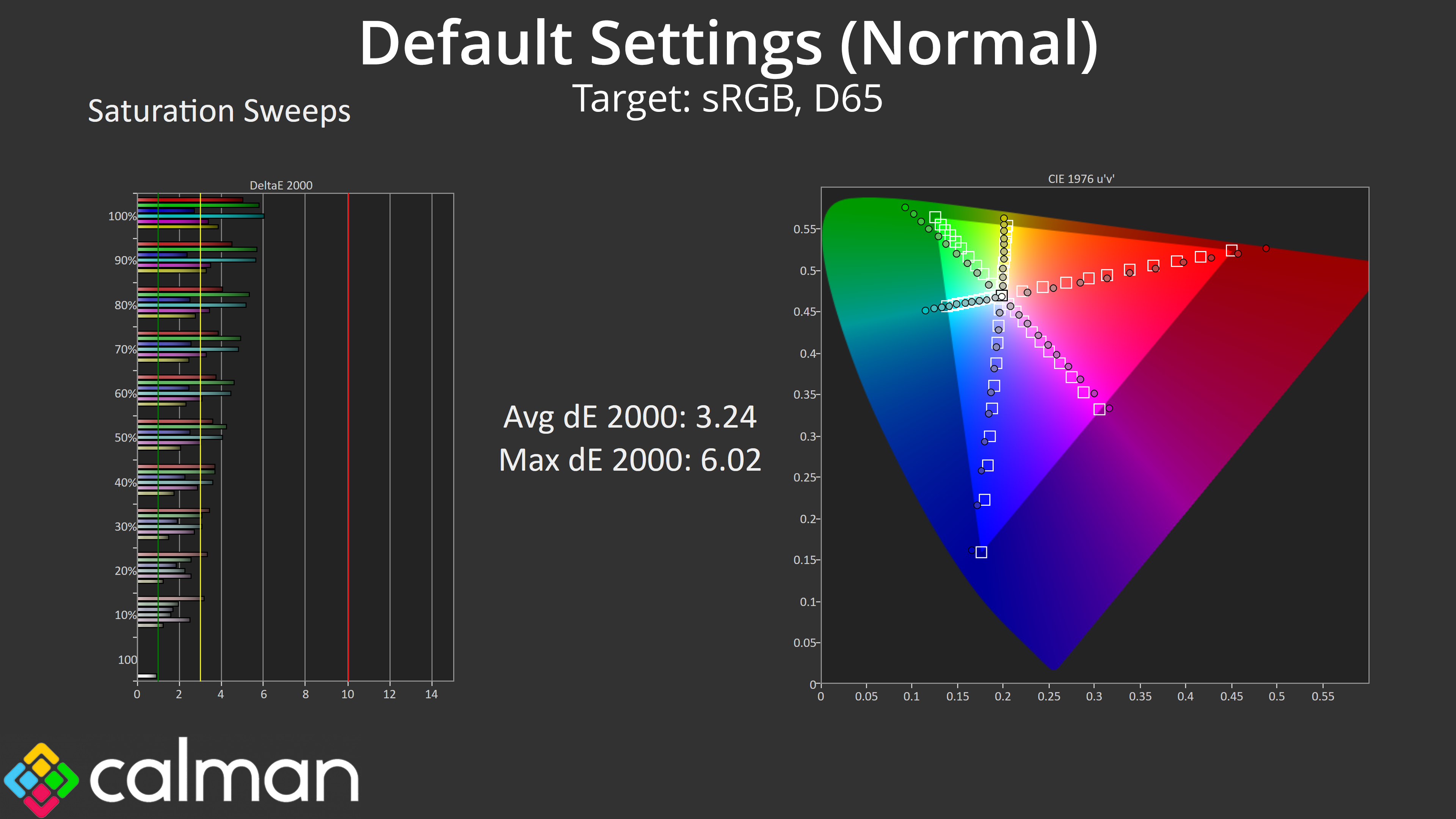 Overall saturation accuracy isn't terrible, but the wide gamut does result in some over-saturation relative to sRGB.