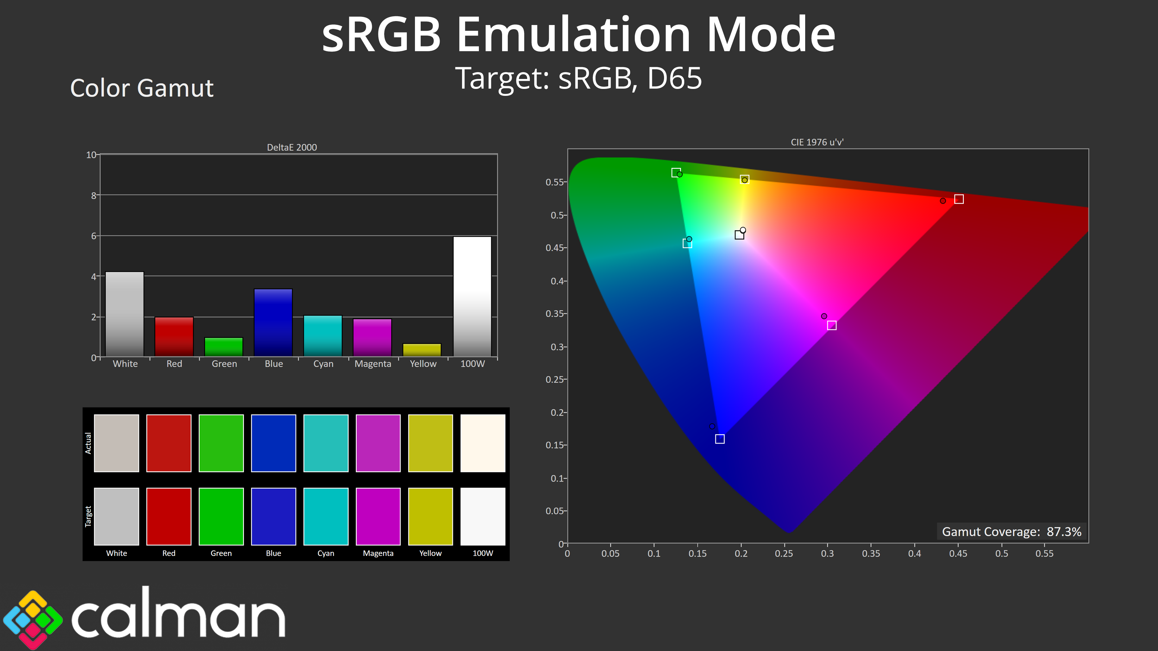 Saturation accuracy is improved compare to the out of the box settings, but as you can see, the sRGB mode is actually too aggressive with its clamping of the colours.