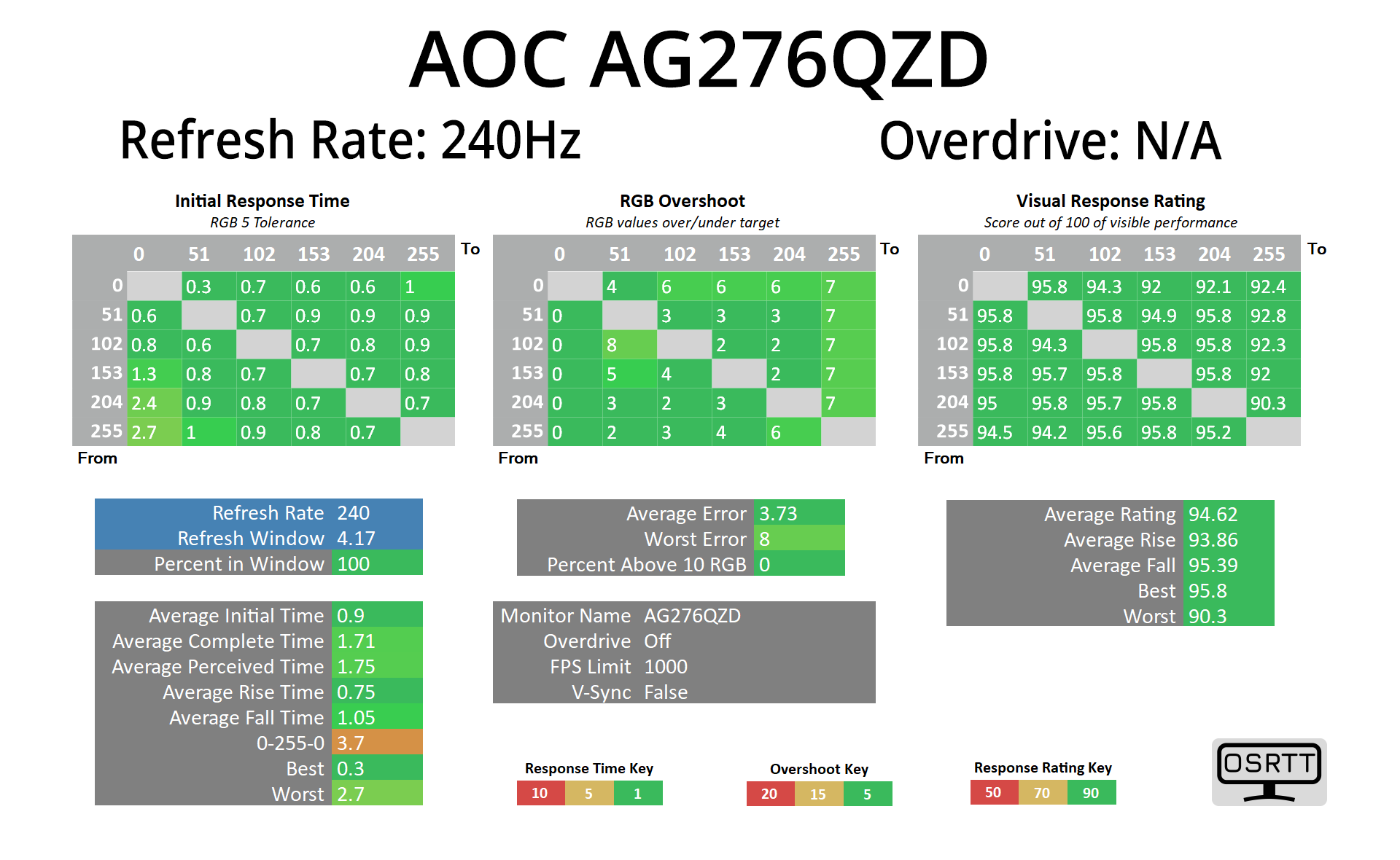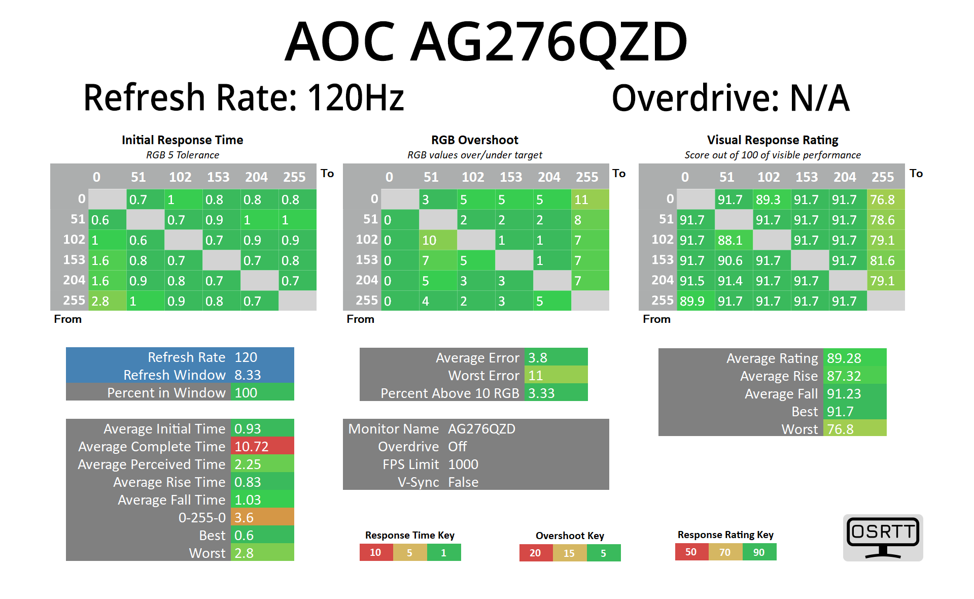 Visual Response Rating is a metric designed to ‘score' a panel's visual performance, incorporating both response times and overdrive. Fast response times with little to no overshoot will score well, while slow response times or those with significant overshoot will score poorly.
