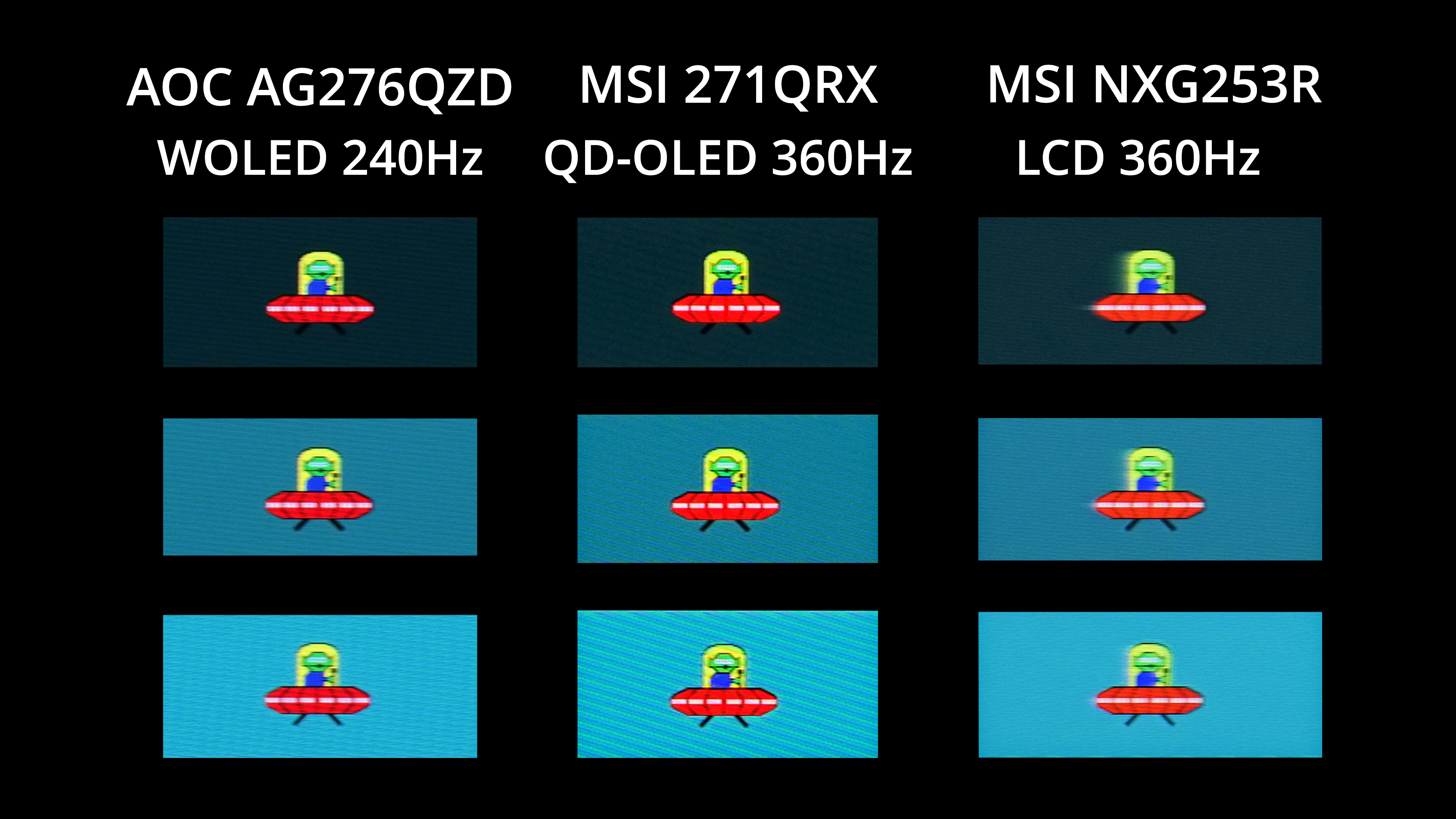 You may be wondering how this 240Hz WOLED compares with the latest 360Hz QD-OLEDs too, so once again I've brought in the MSI MPG271QRX that I reviewed recently. I honestly don't think it is a massive difference, but you can see the 360Hz image is just that bit clearer – particularly when looking at the white lines on the UFO, and the alien's face. However, this 240Hz WOLED still offers better clarity than a 360Hz LCD, in the form of MSI's Oculux NXG253R, so it's very impressive overall.