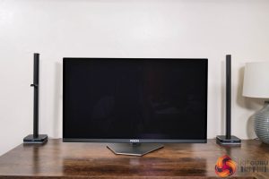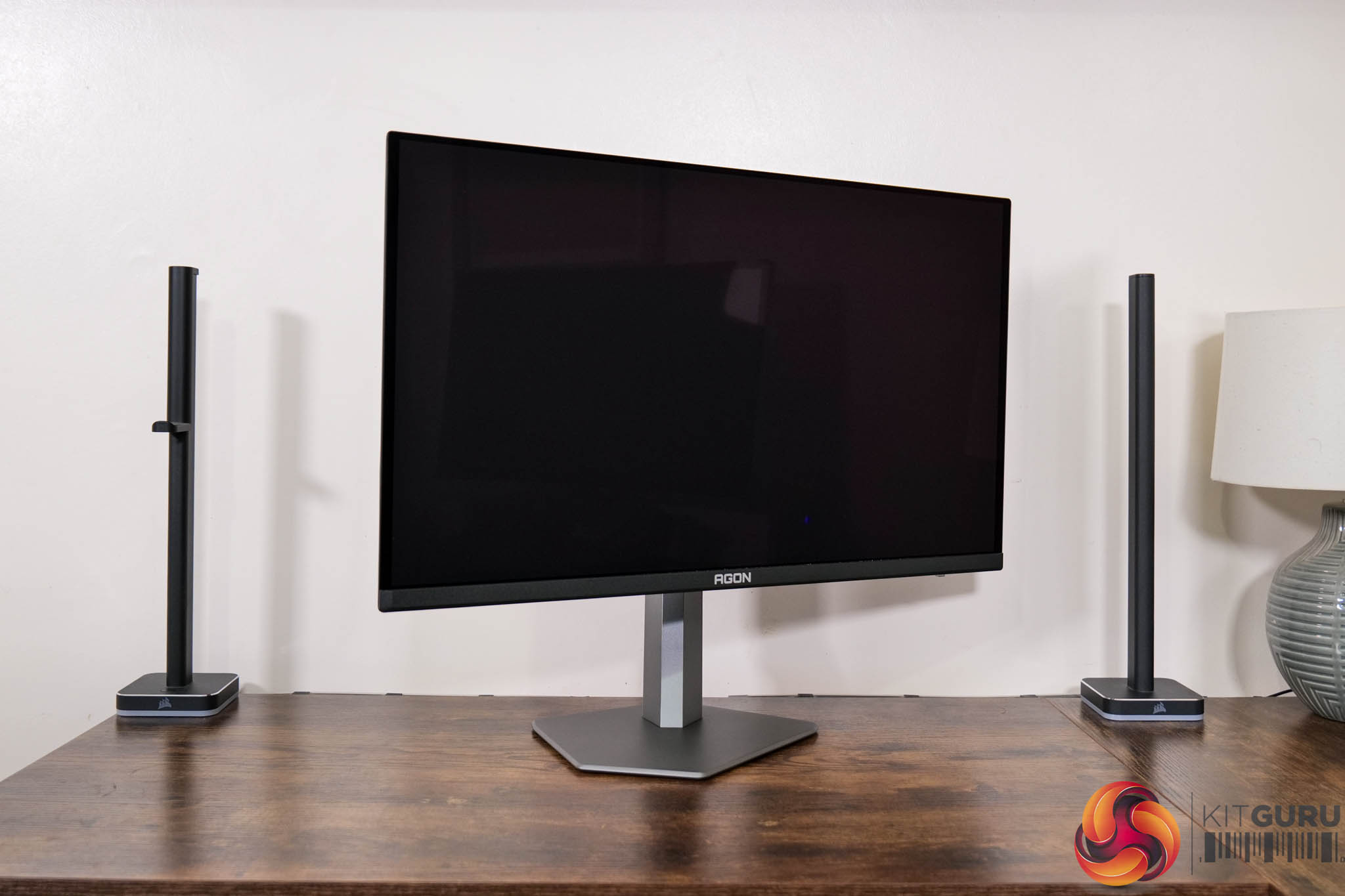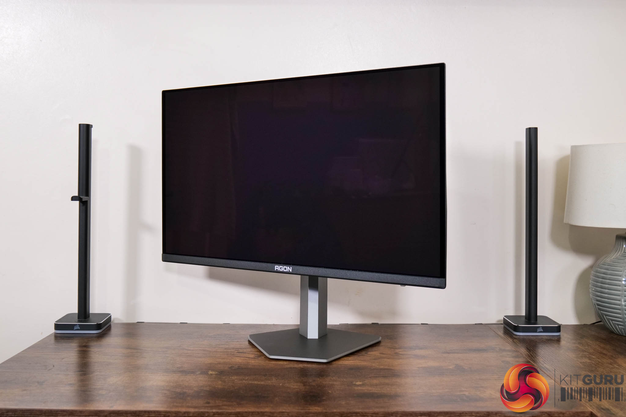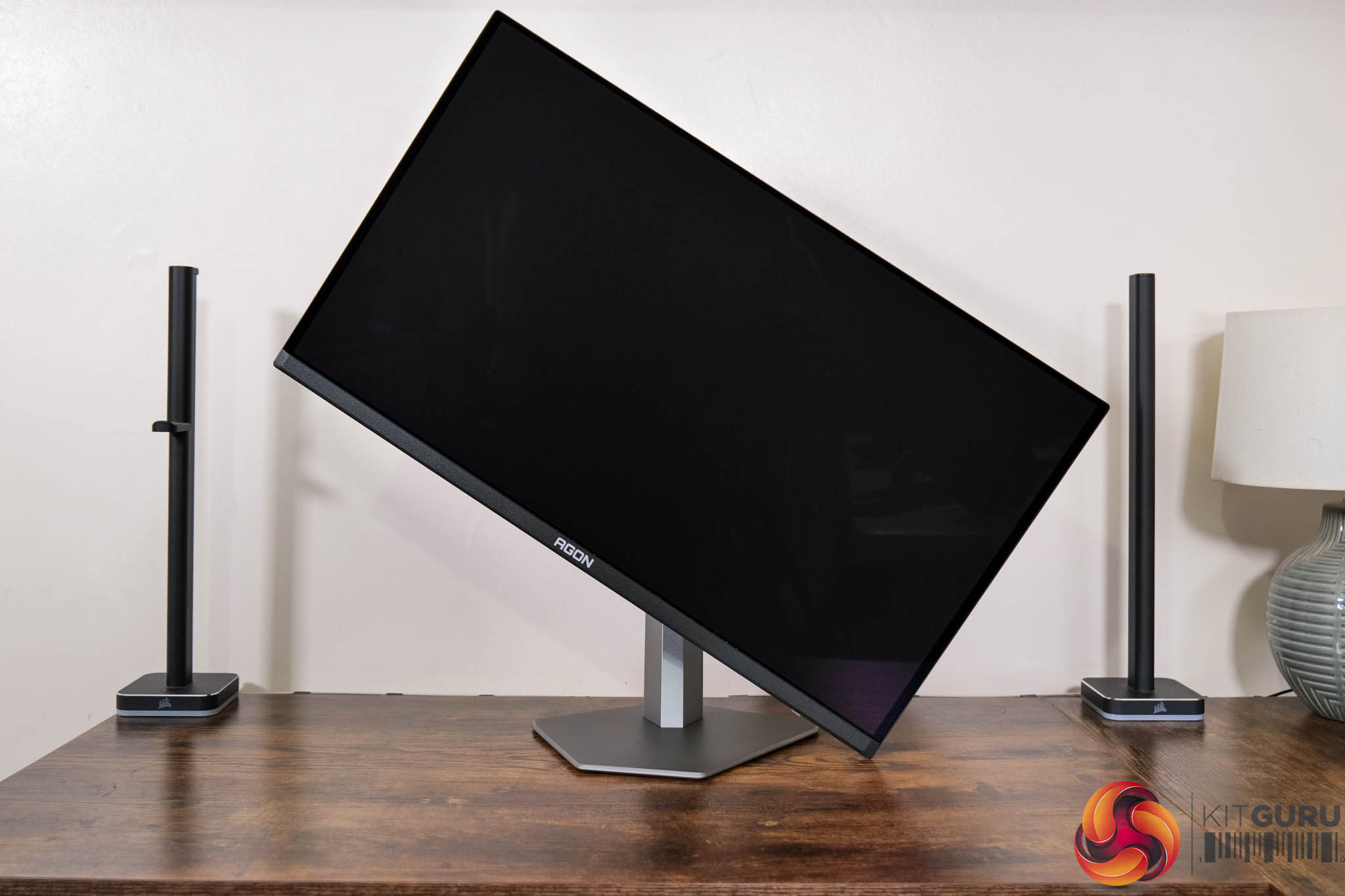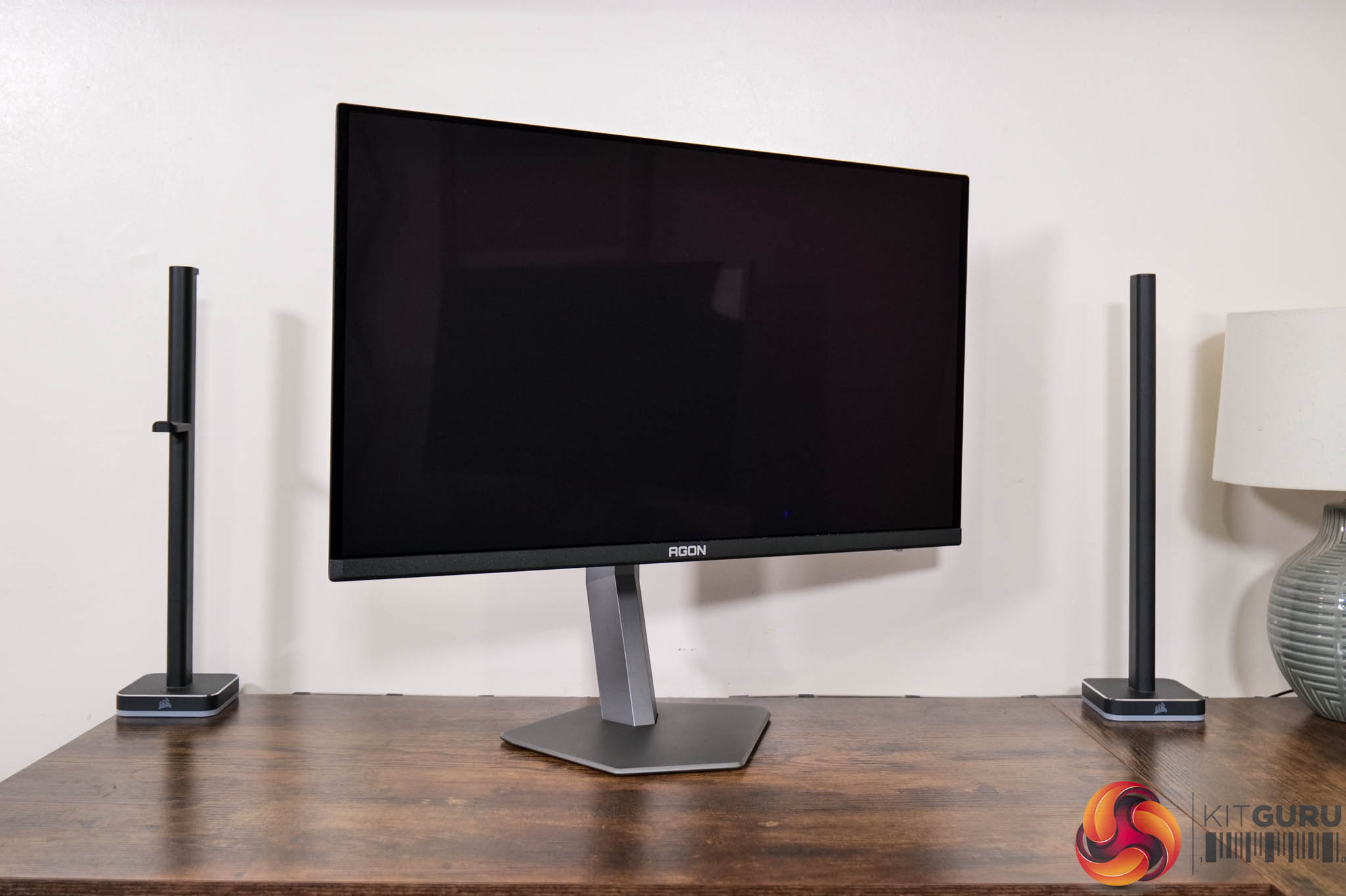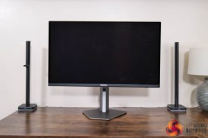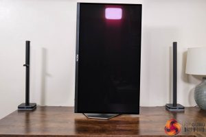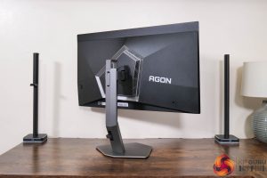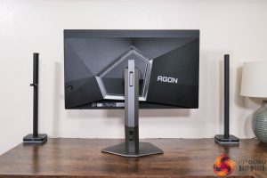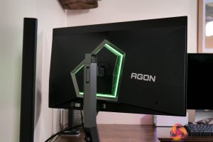 In terms of the design, if you saw my review of AOC's AG276QZD – a 1440p/240Hz WOLED panel – then you will be instantly familiar with what AOC is doing for the AG276UZD, as very little appears to have changed. The front is conventional with a three-sided frameless design, while the back is made from black plastic. The stand attaches in the middle of an asymmetrical area which is surrounded by RGB LEDs, as you can see below.