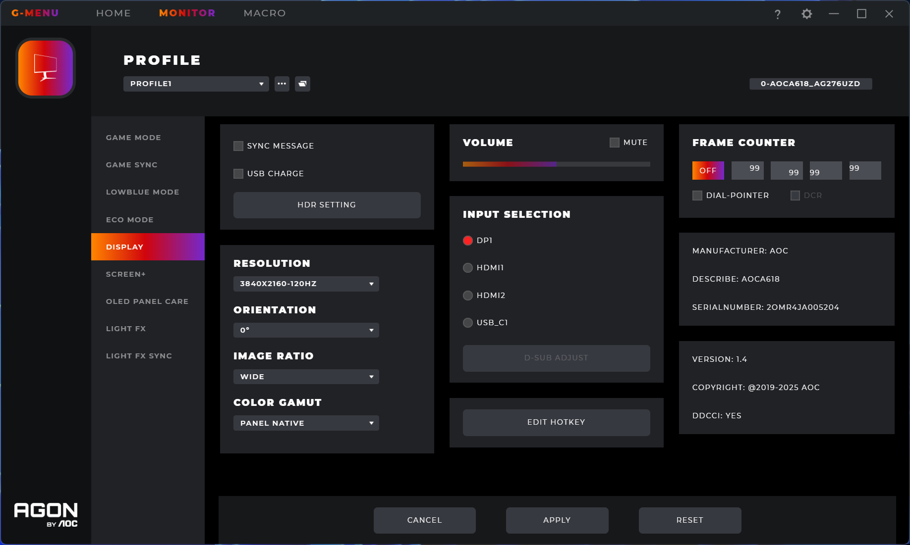 As for the OSD itself, I admit I was very surprised to see AOC using its older and now very dated menu system for the AG276UZD. After all, this monitor only launched in May, and we've seen other screen recently – like the U27G4R – that have been updated with a much more modern OSD system. I did ask AOC about this and they told me the next generation of OLED screens would be updated, but there were no plans to push a firmware update for the AG276. It's at least a functional OSD complete with the features we'd expect to see, I just think it looks very clunky and dated in 2025.