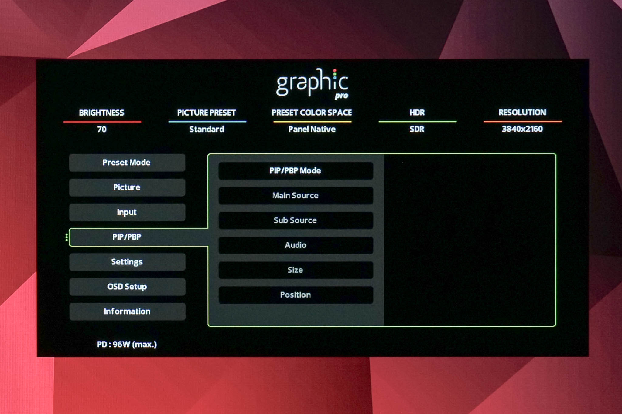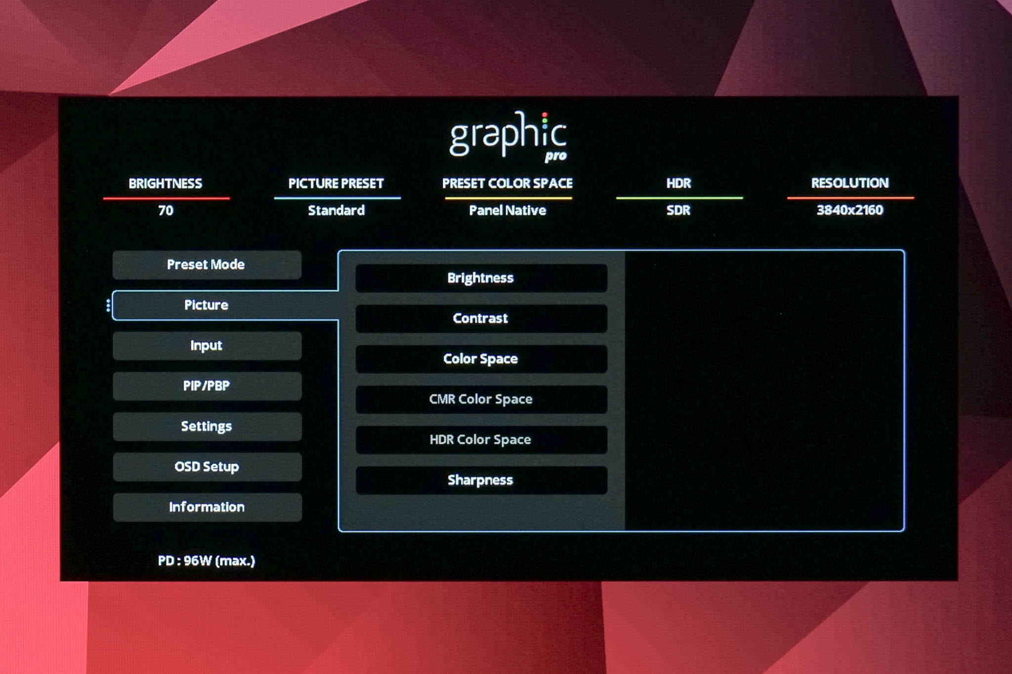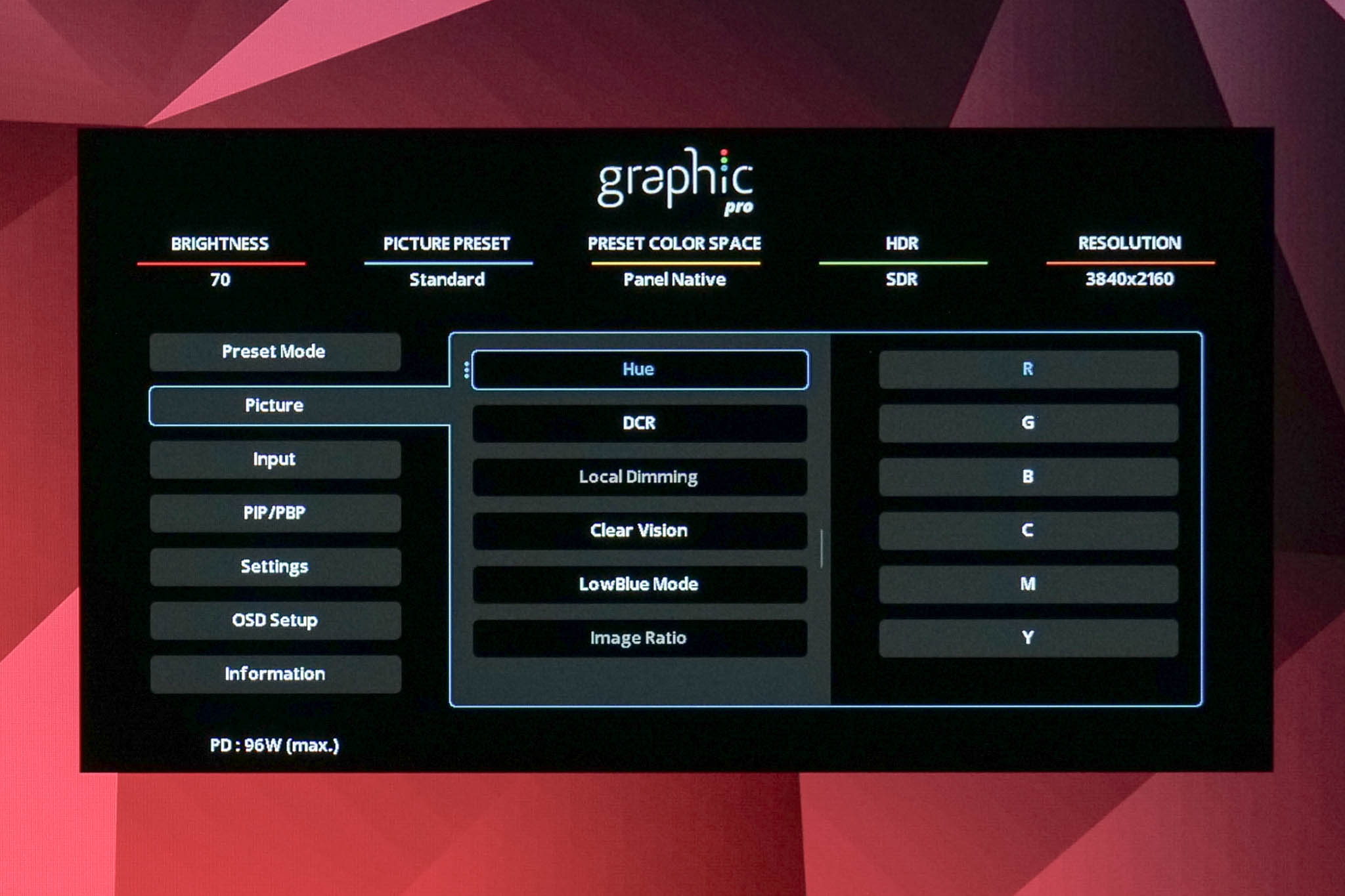 On top of that, there's even some gaming-oriented options like Game Color and Overdrive, the latter of which I was surprised to see considering this is a pro-grade monitor. Then you have controls for the USB connectivity, PIP/PBP, KVM and more.