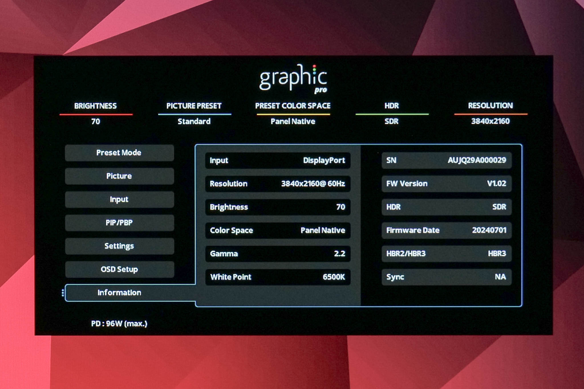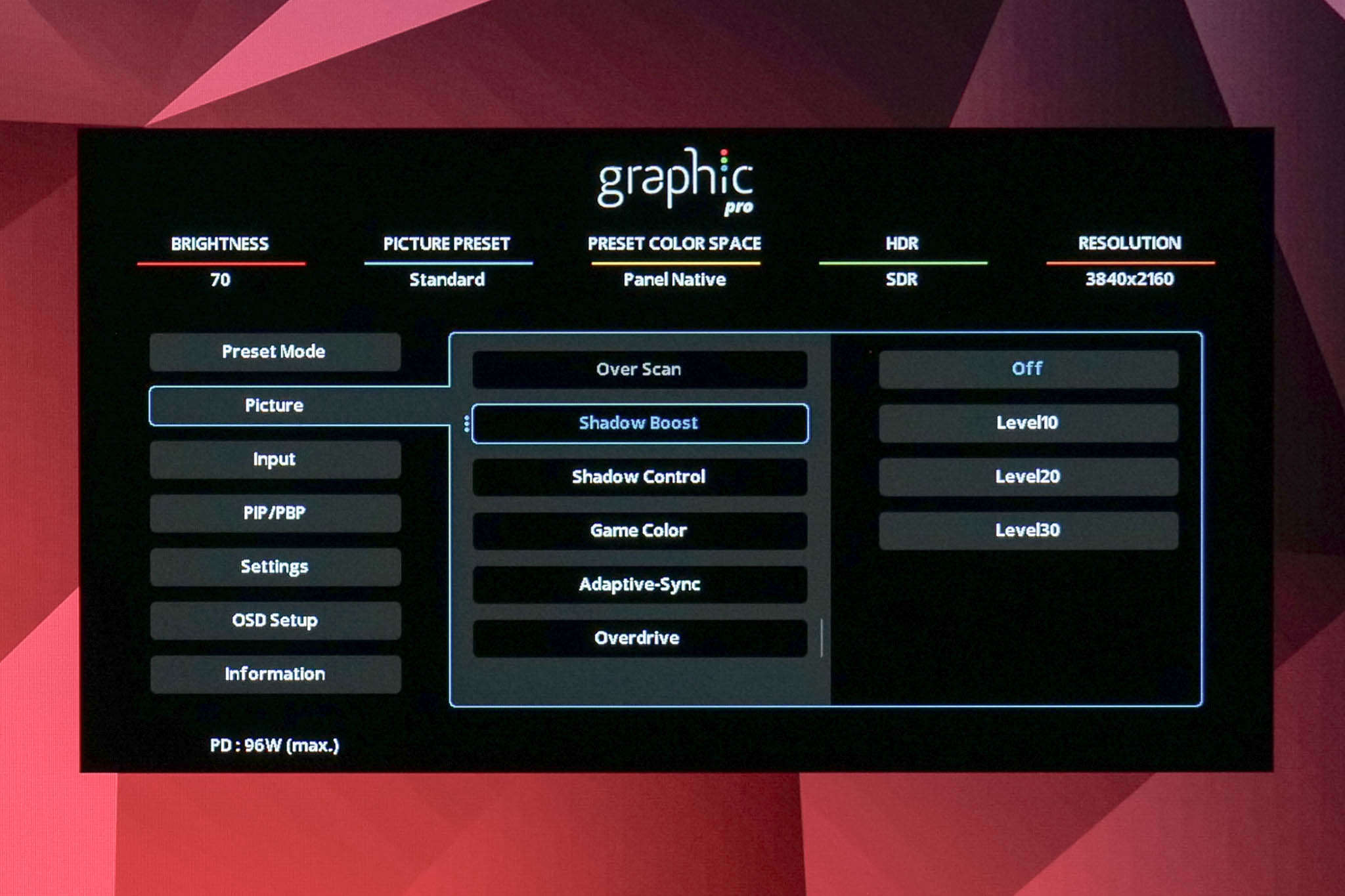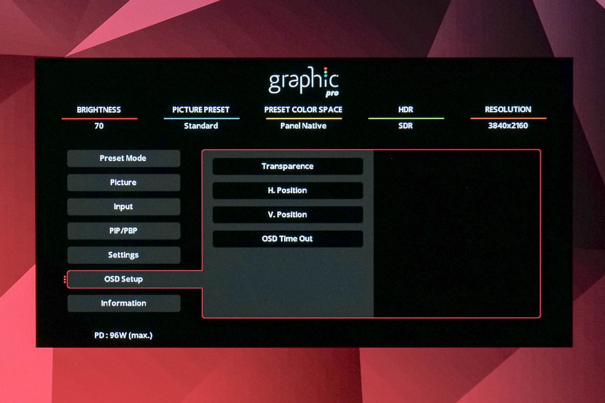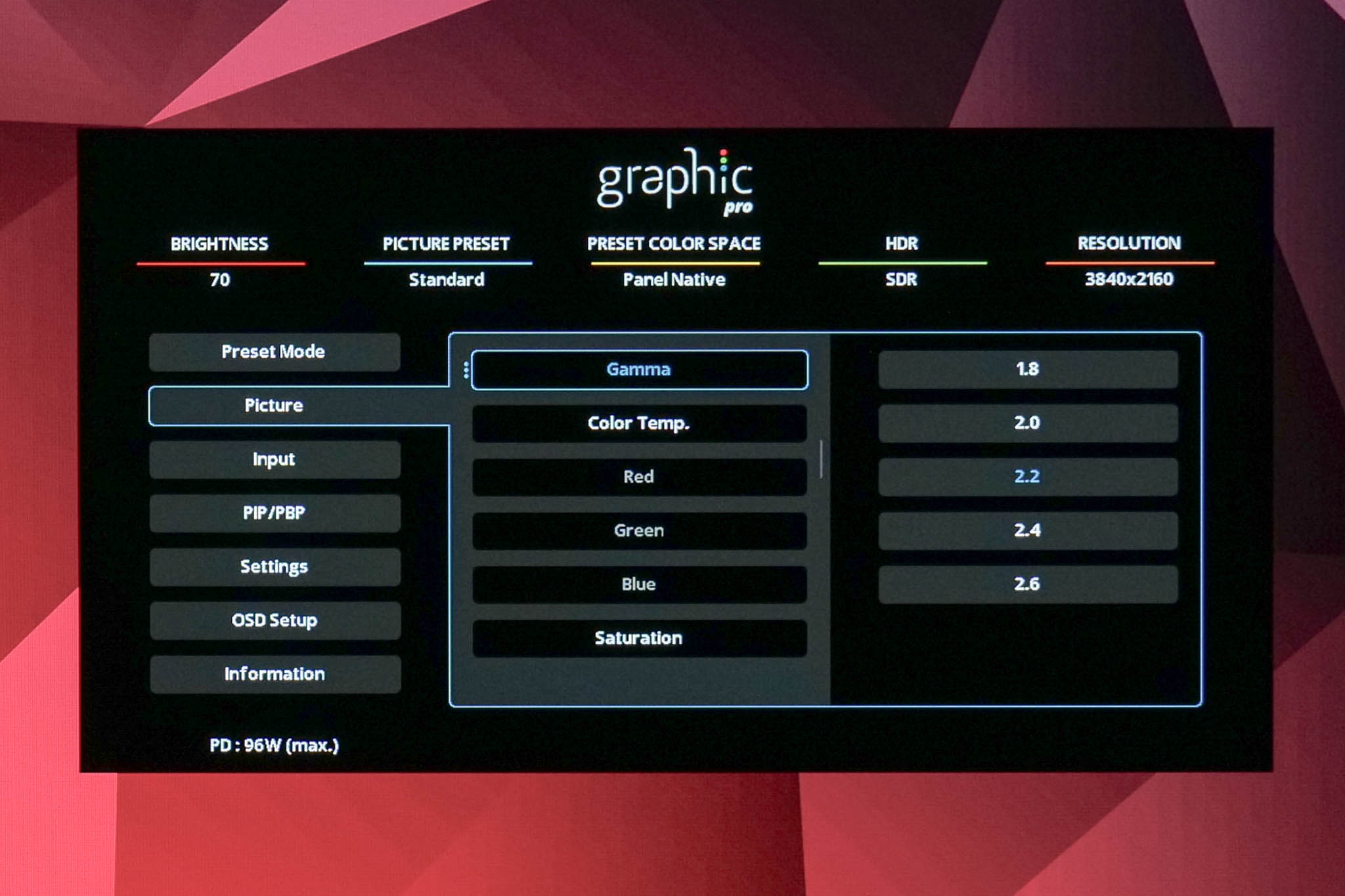 On top of that, there's even some gaming-oriented options like Game Color and Overdrive, the latter of which I was surprised to see considering this is a pro-grade monitor. Then you have controls for the USB connectivity, PIP/PBP, KVM and more.