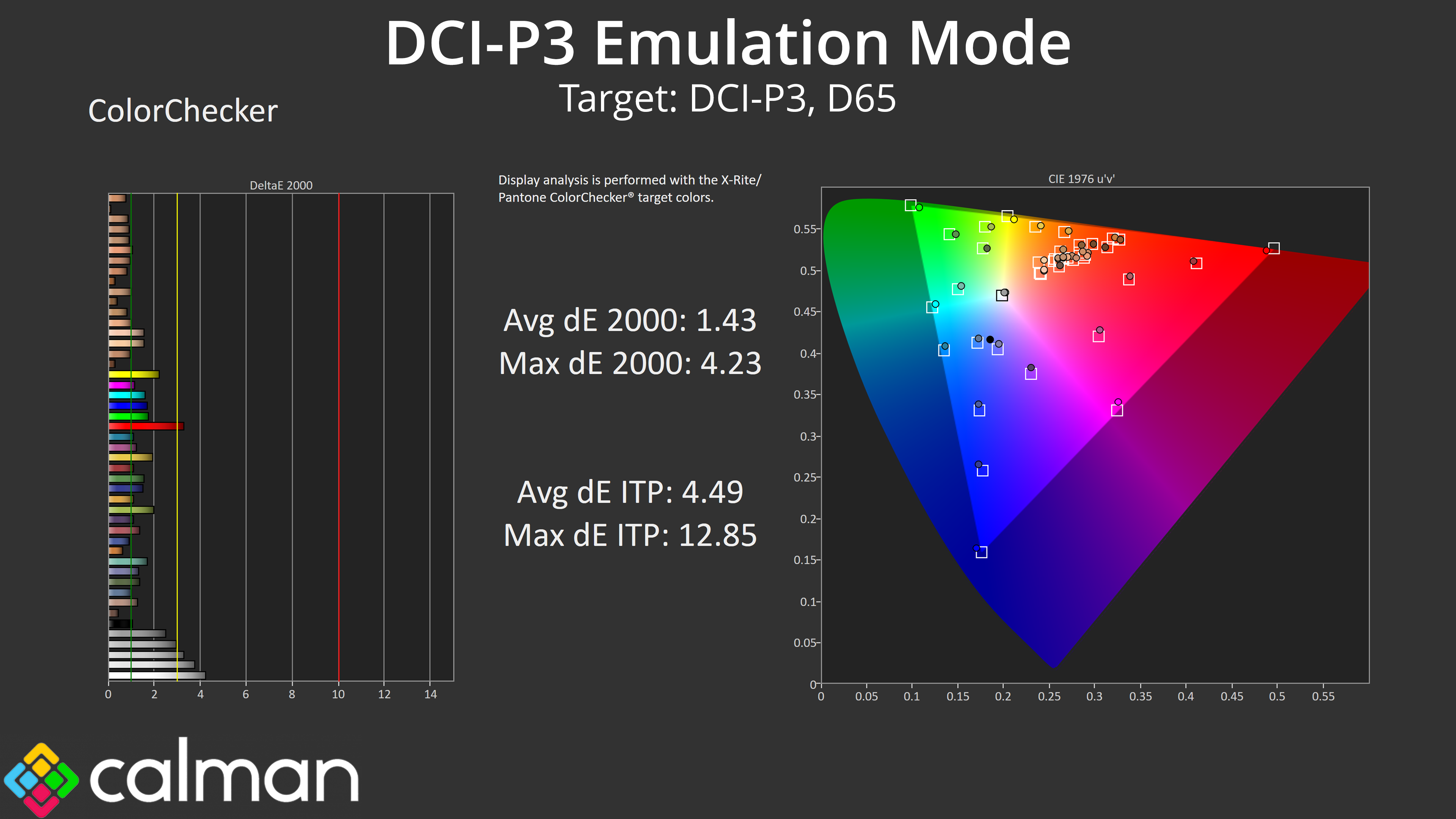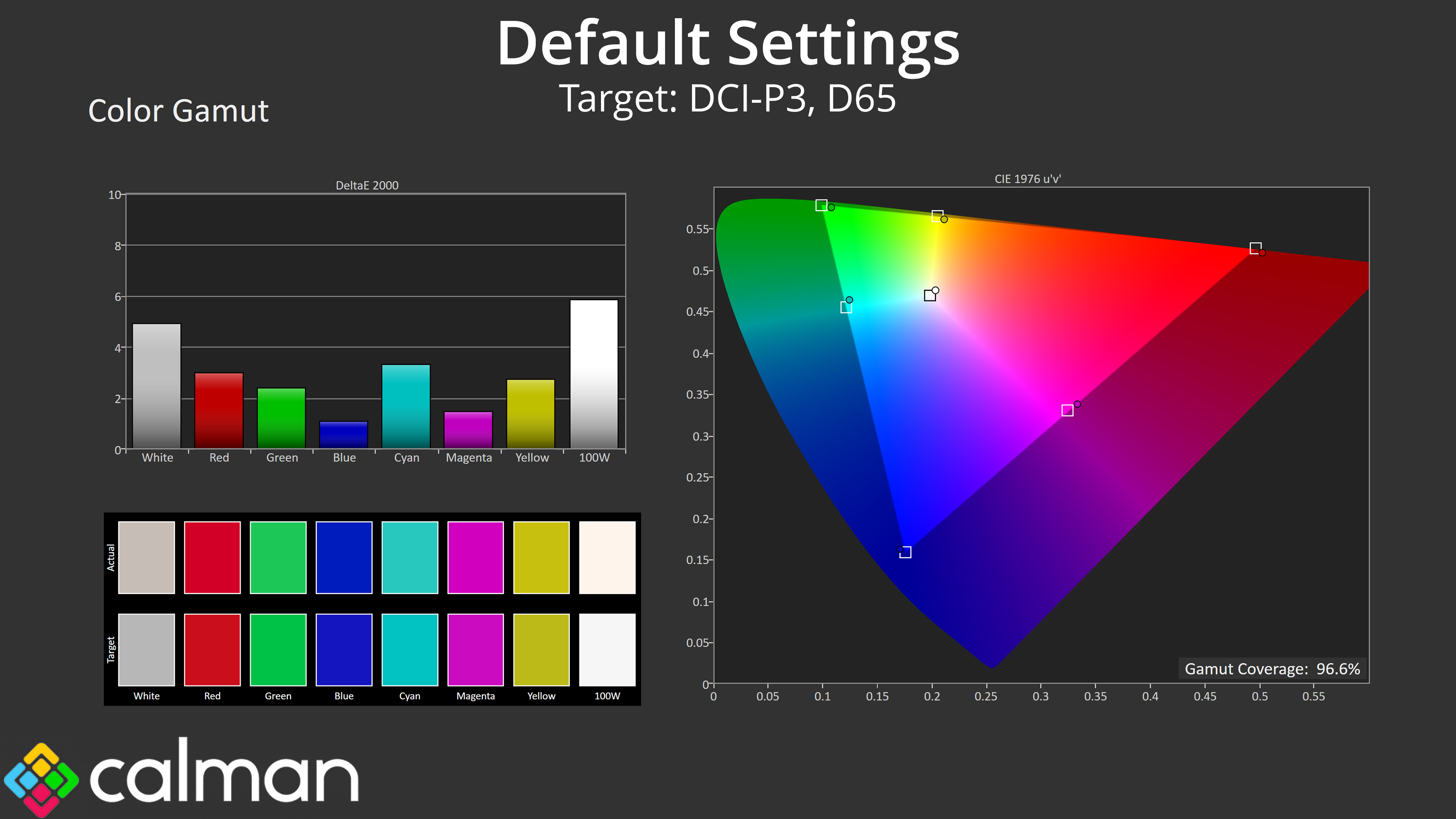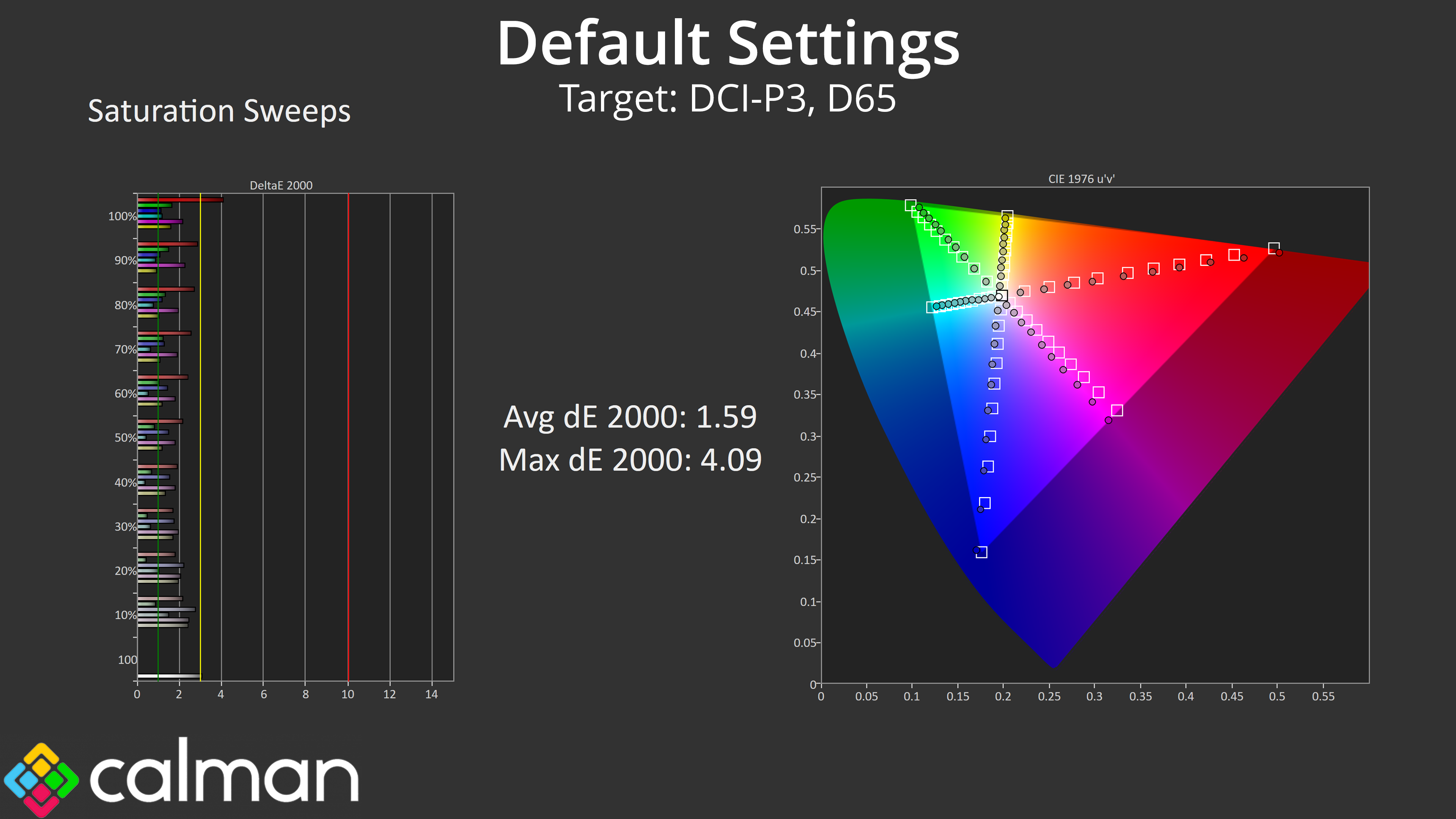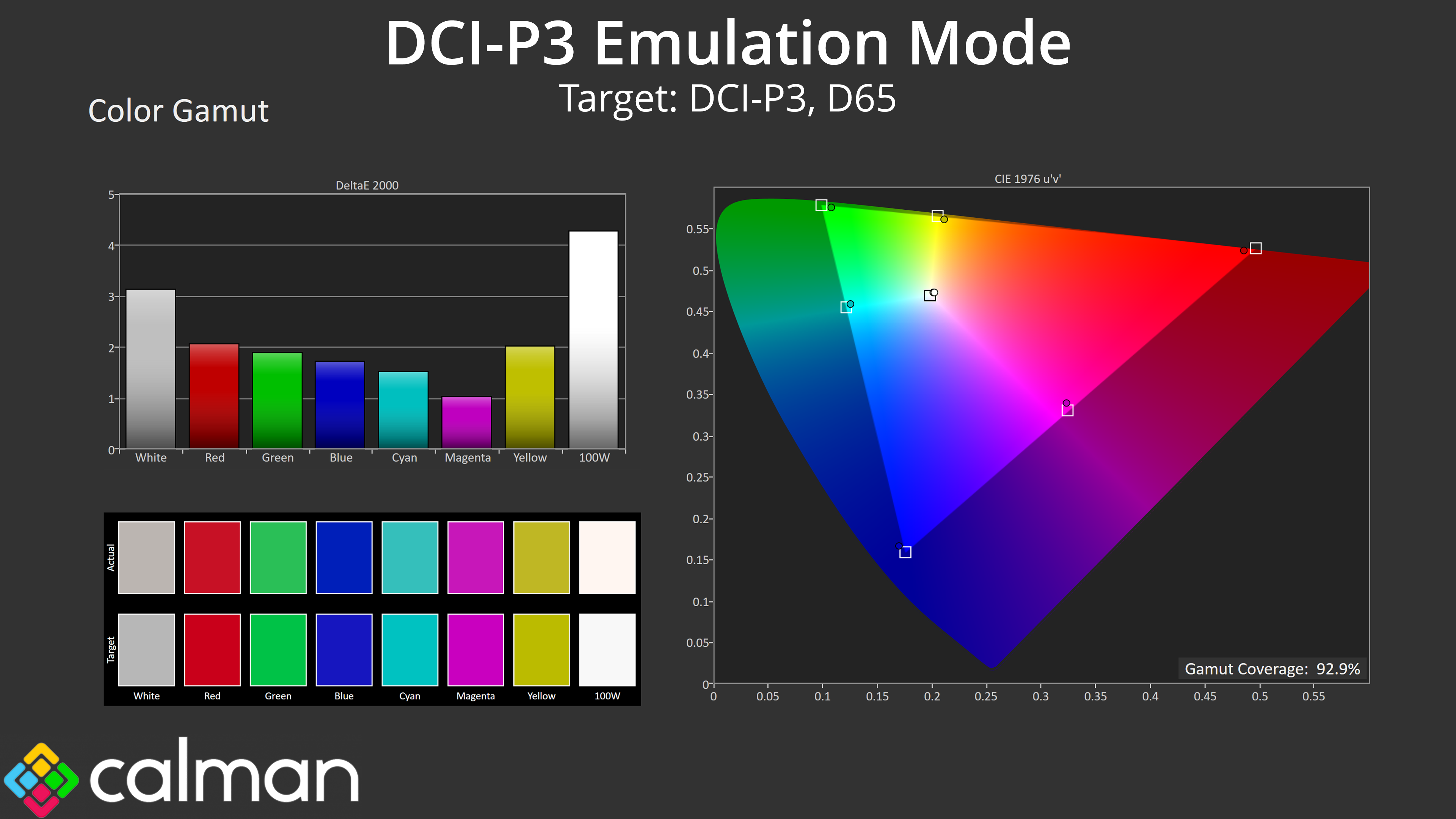 Relative to the DCI-P3 space, things improve once again, and we see an average dE 2000 of just 1.7, which is very good for a factory calibration.