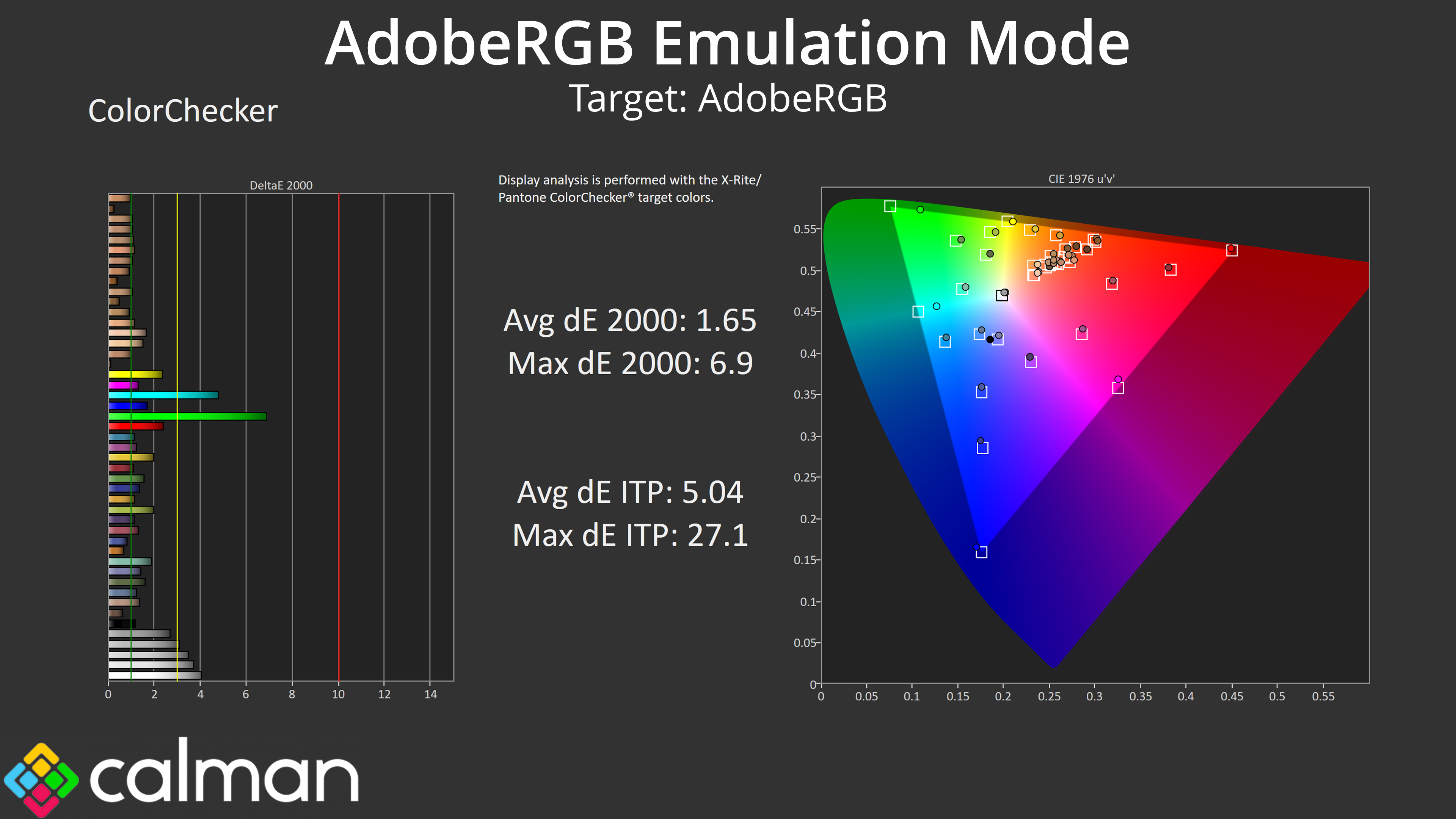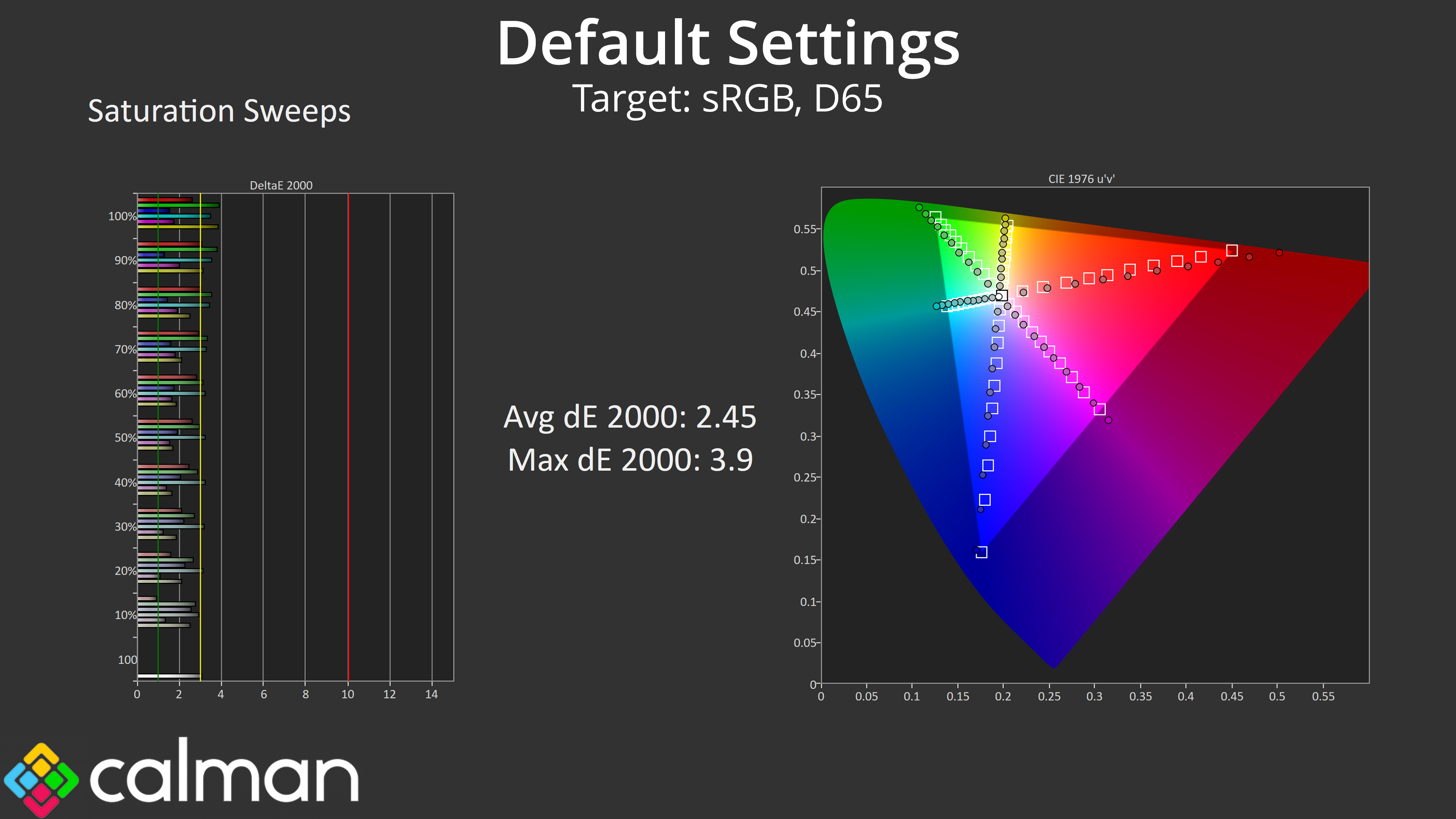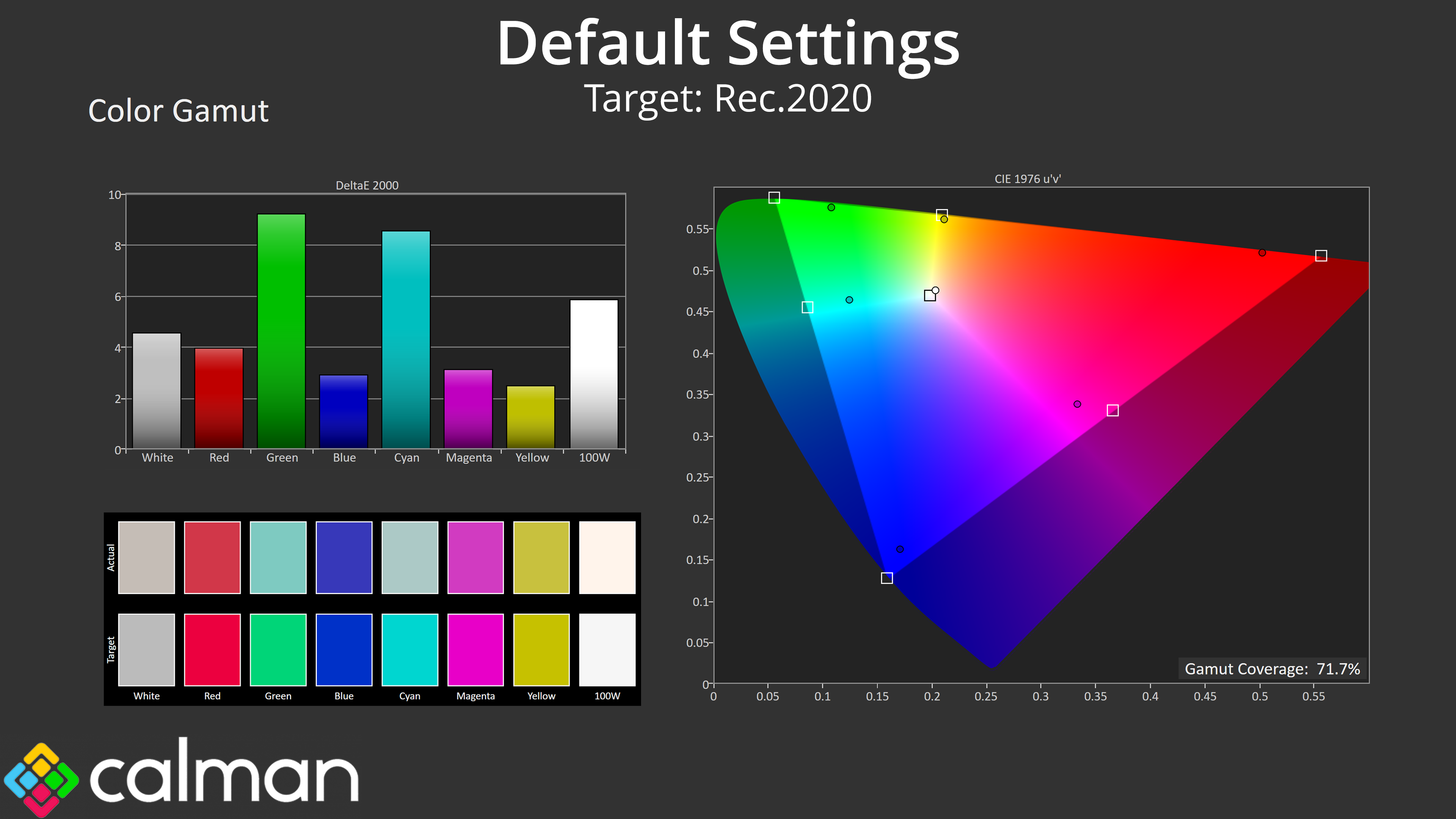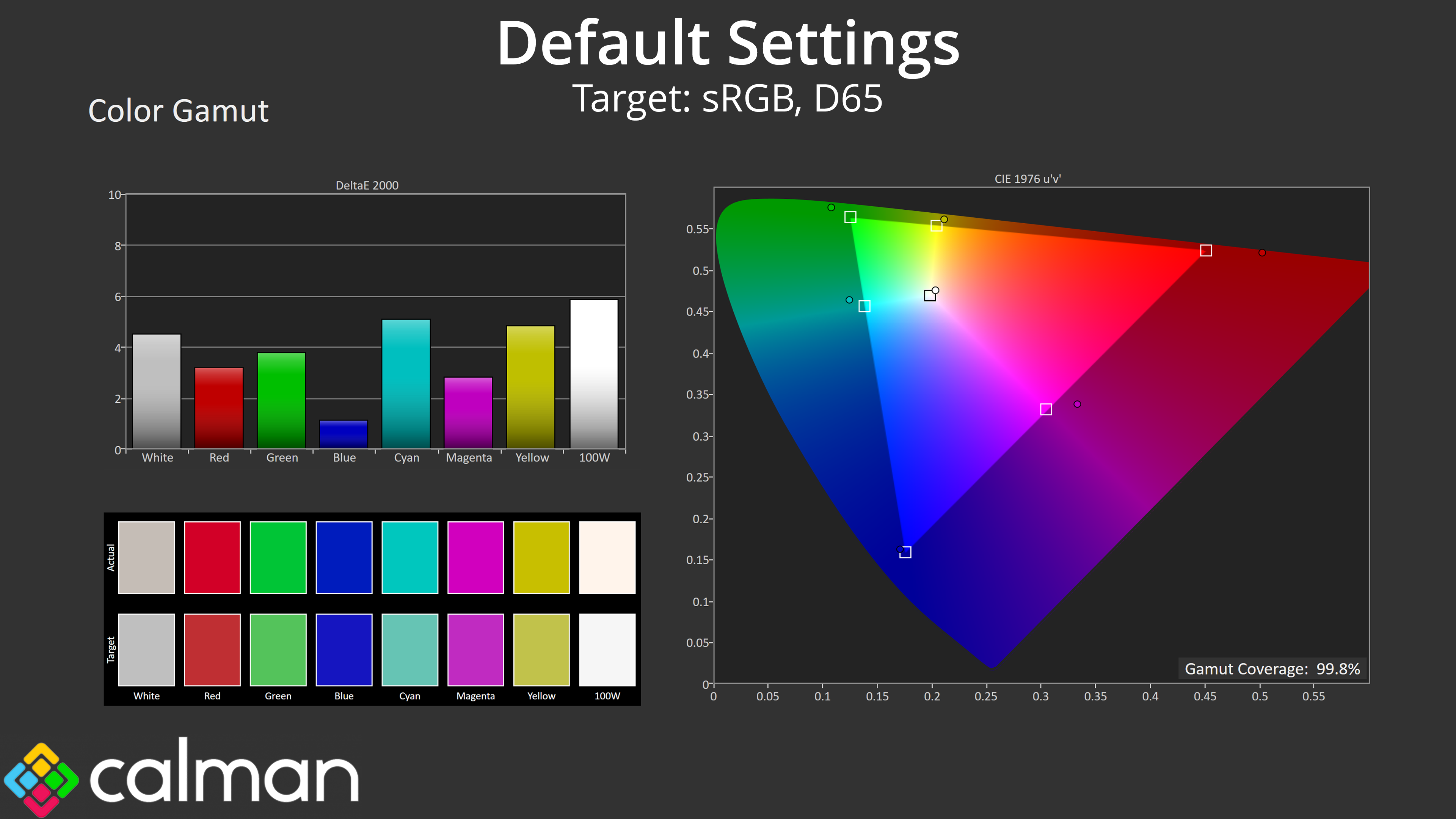 Relative to the DCI-P3 space, things improve once again, and we see an average dE 2000 of just 1.7, which is very good for a factory calibration.