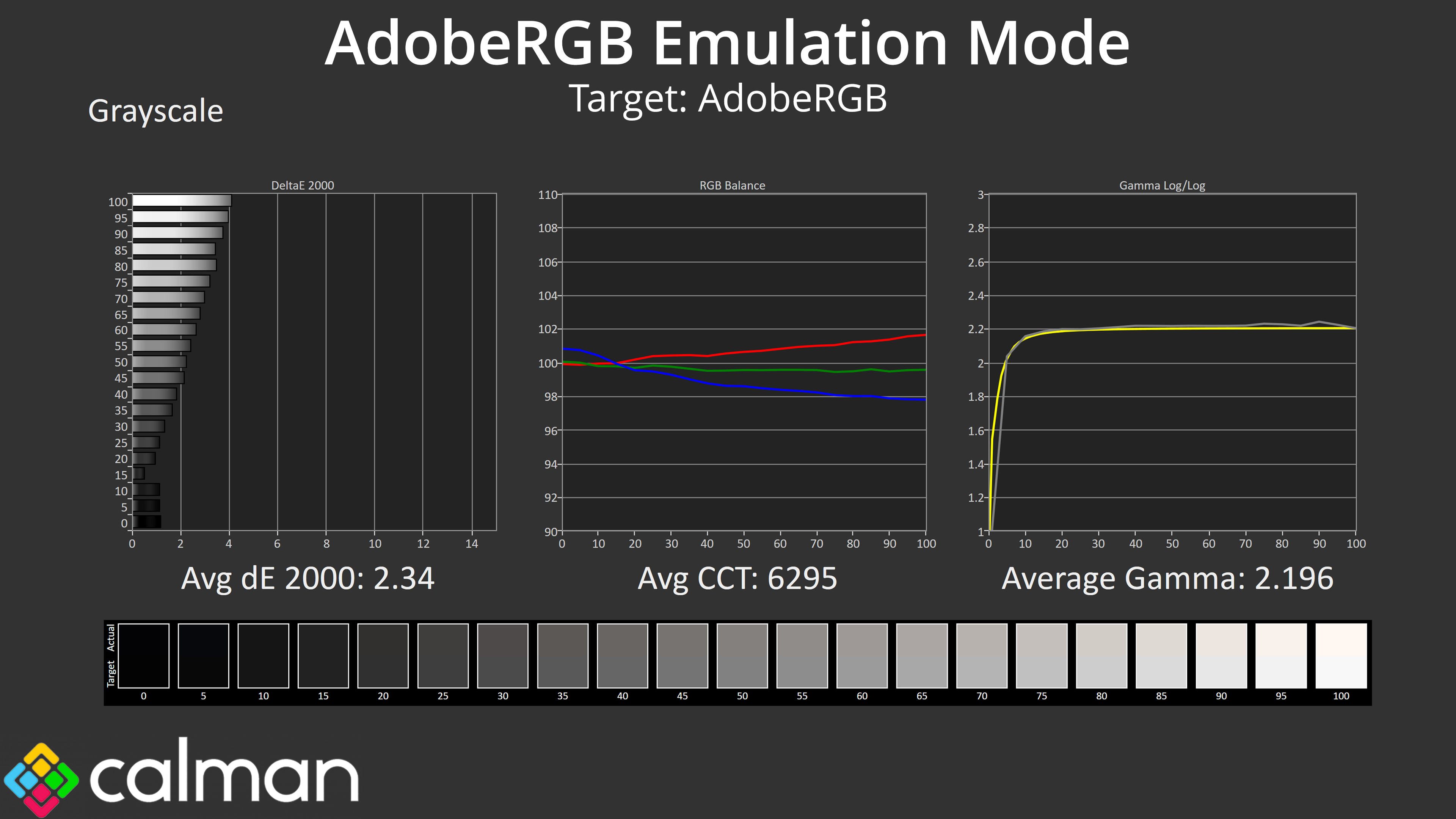 - Greyscale accuracy, measured across 20 shades, with an average colour balance reported.