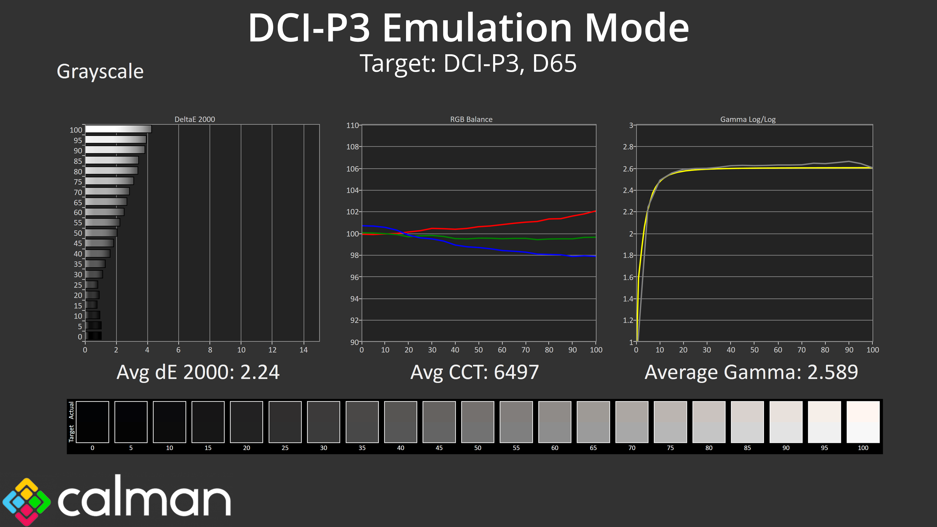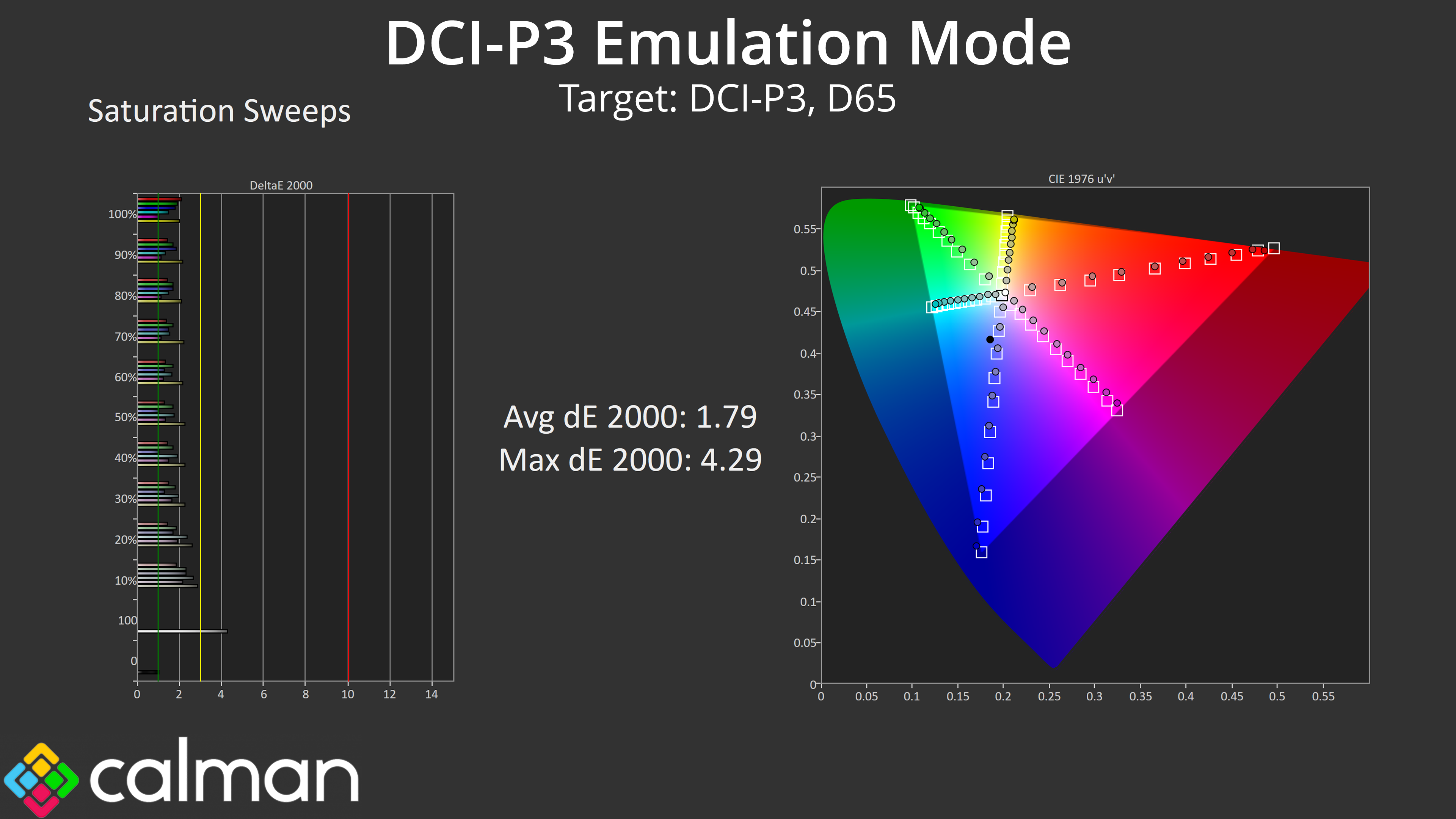The DCI-P3 mode is arguably the best of the lot, with accurate greyscale and both saturation and colour accuracy average deltaEs below 2. I'm happy to recommend using any of these emulation modes if you need to work with these colour spaces.