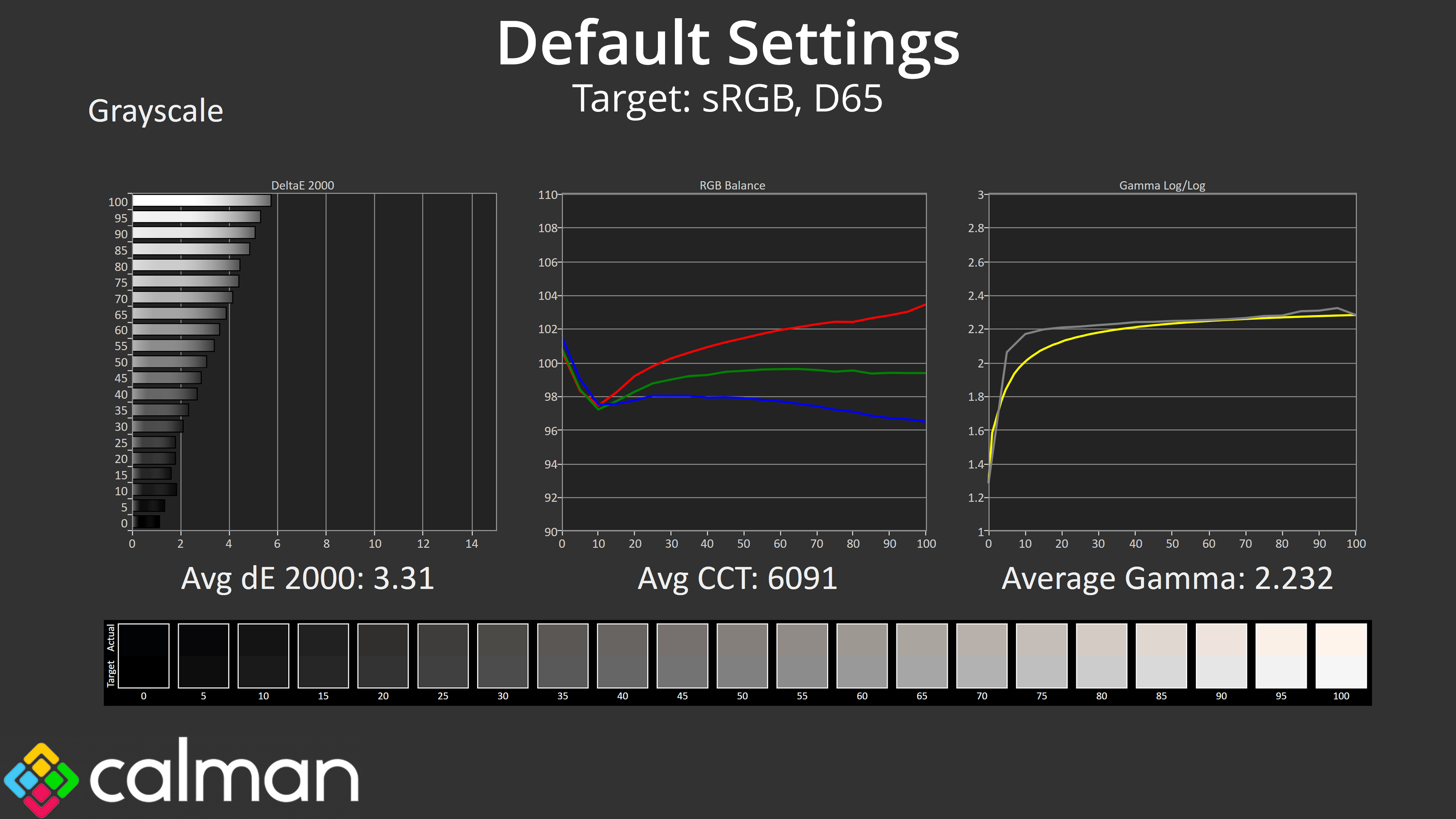 Moving onto greyscale, first we test with completely stock, out of the box settings. This gives reasonably accurate results, though it is slightly warm with an average CCT (correlated colour temperate) of 6091K, a 7% deviation from the 6500K target. That results in an average greyscale dE 2000 of 3.31, which is decent but not spectacular. Gamma, however, is very good indeed, tracking the curve nicely and delivering an average result of 2.232.