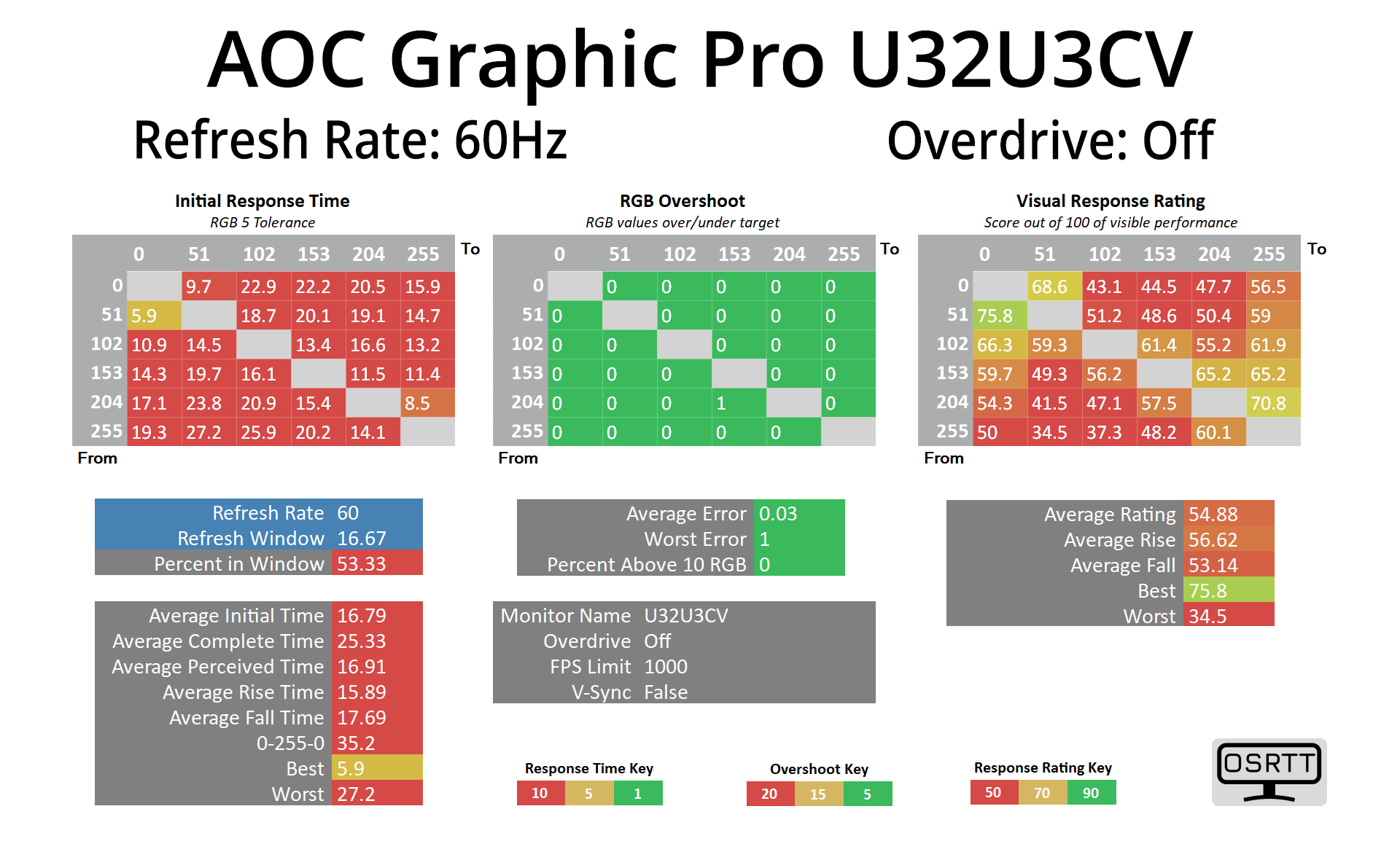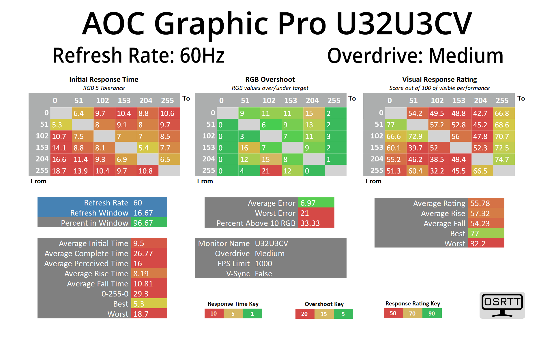 Overshoot is the term given for when a monitor's transition exceeds or goes beyond its target value. So if a monitor was meant to transition from RGB 0 to RGB 55, but it hits RGB 60 before settling back down at RGB 55, that is overshoot. This is presented as RGB values in the heatmaps – i.e. how many RGB values past the intended target were measured.