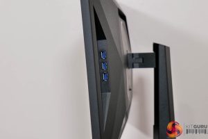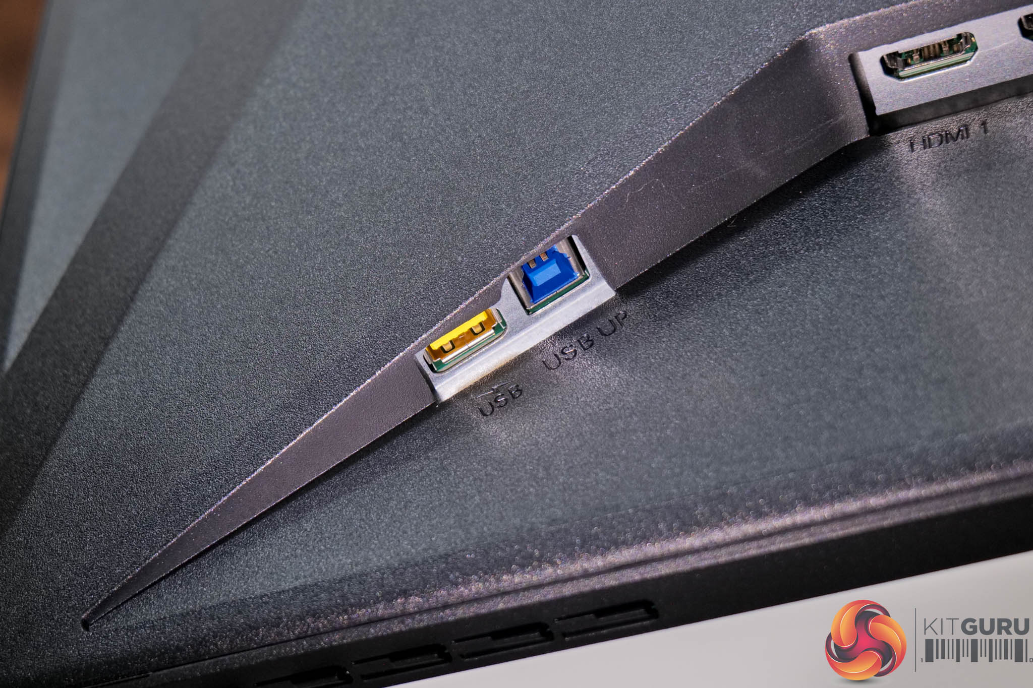 Just to the left of that, there's the USB Type-B upstream connector and a single Type-A downstream – the yellow colouring indicates it's a fast charging port. Three more regular Type-A downstreams are also placed on the right-hand edge of the monitor.