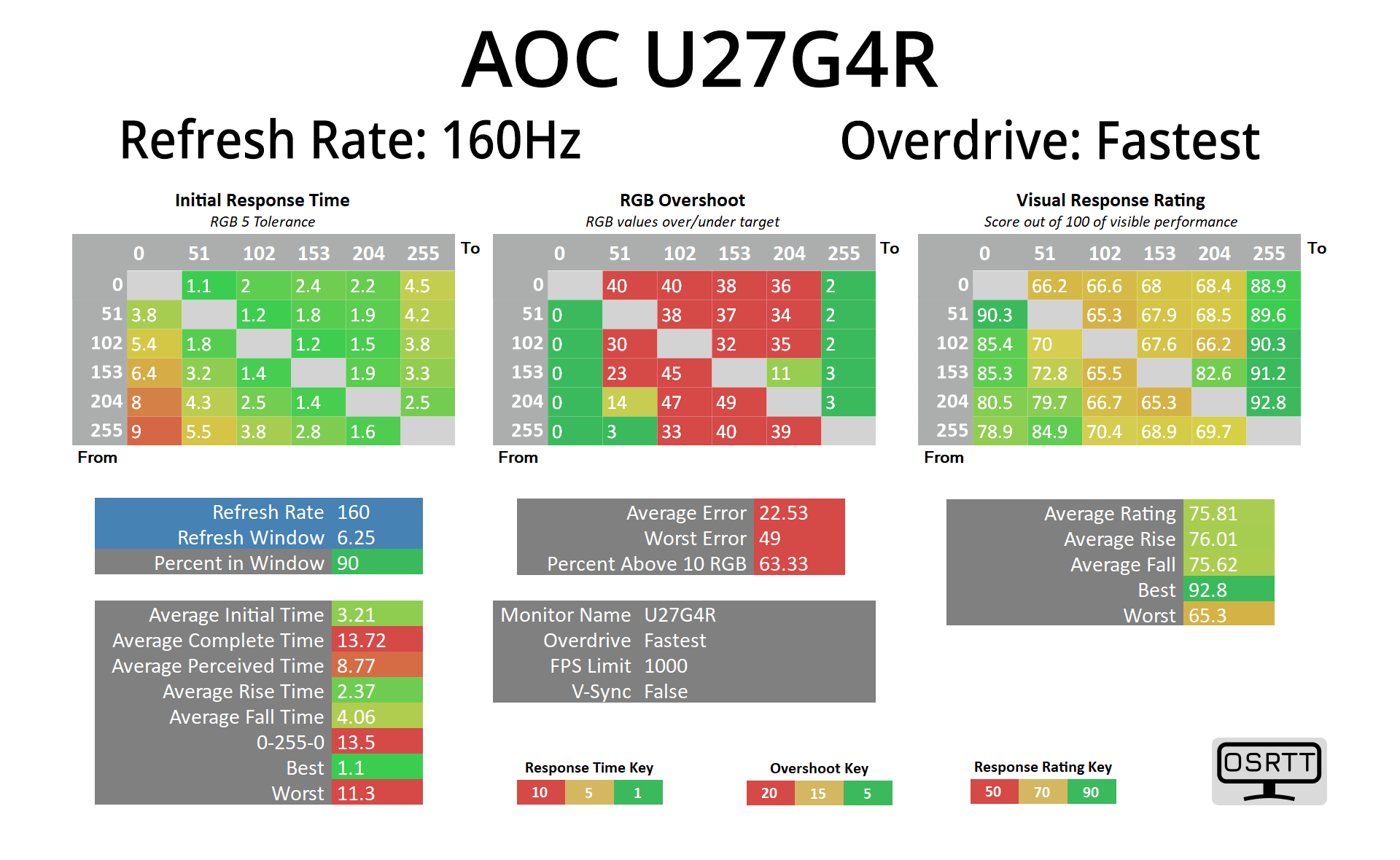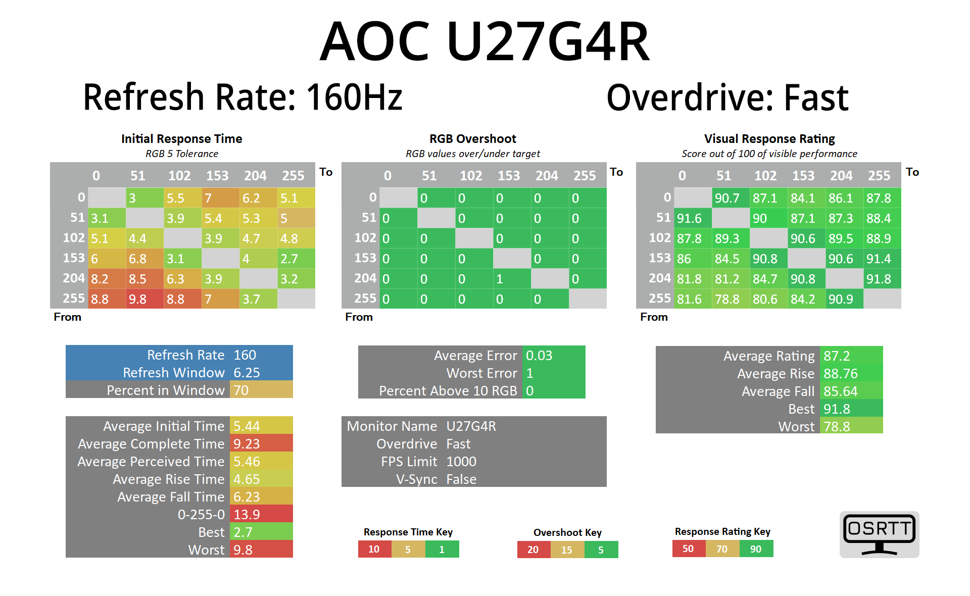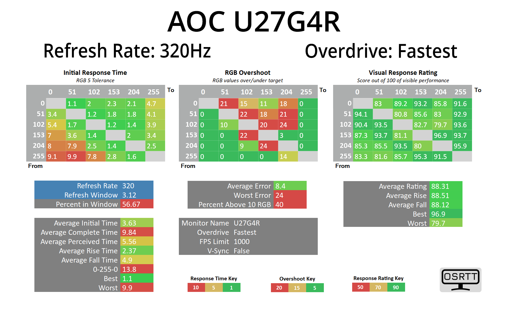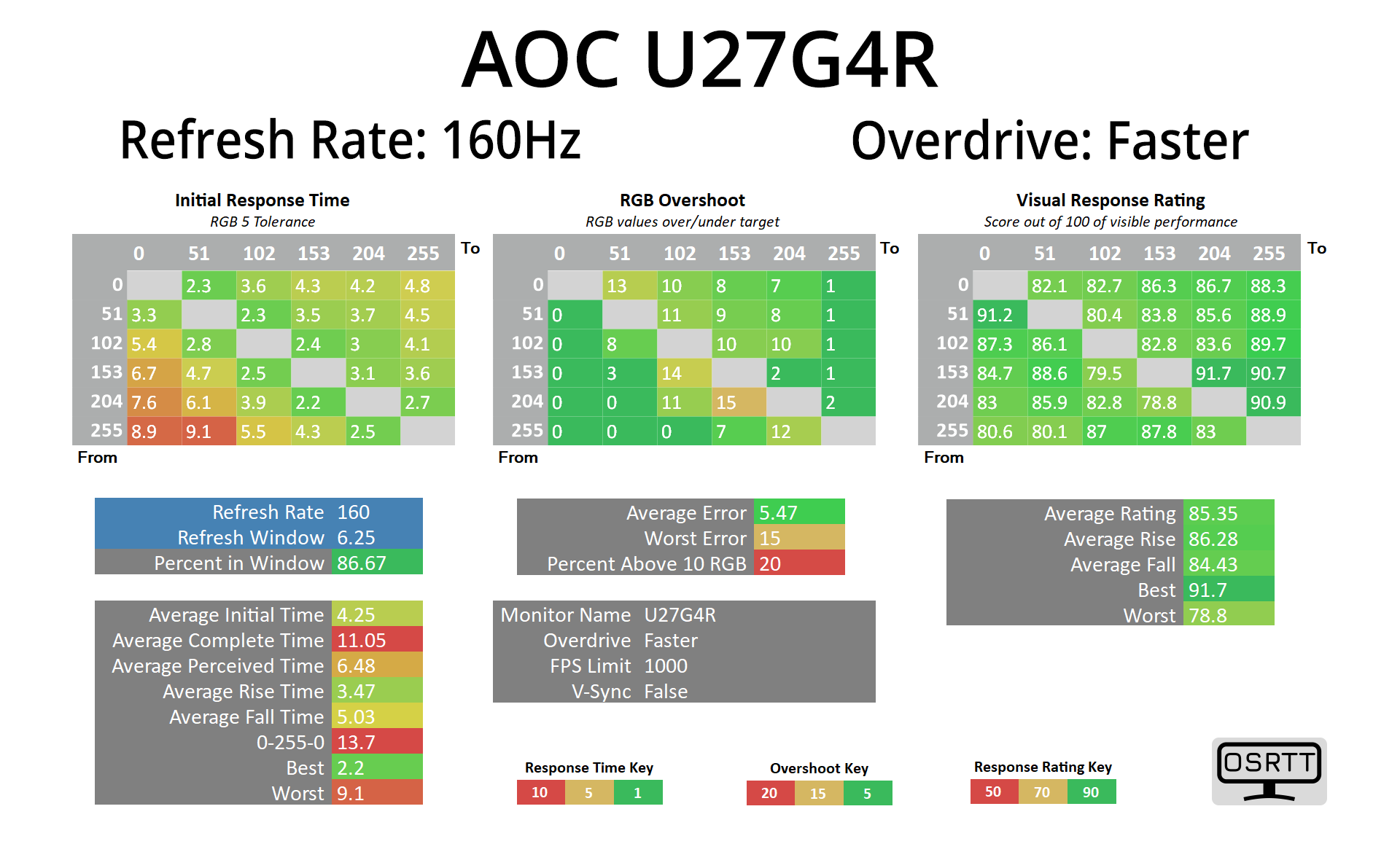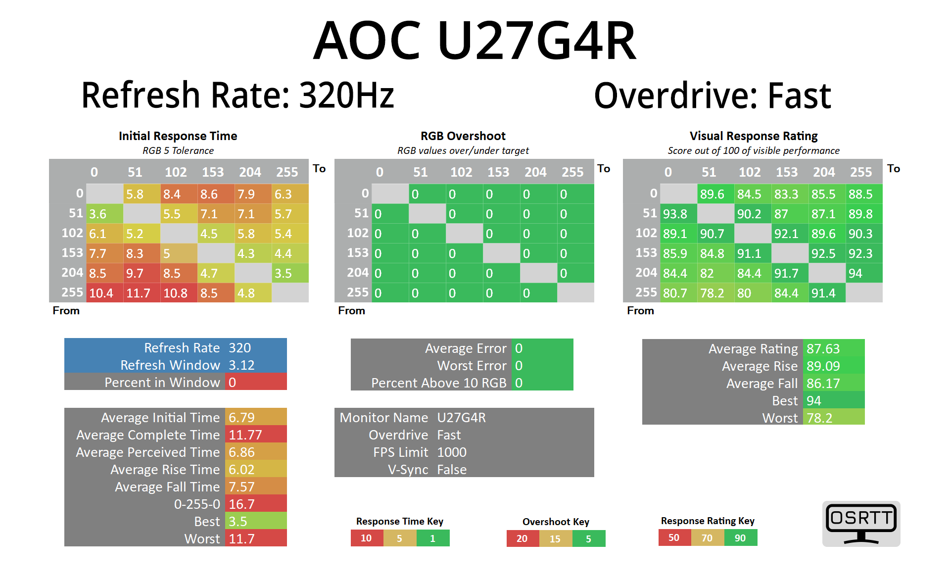 We use the Open Source Response Time Tool (OSRTT), developed by TechTeamGB, for our response time testing. This measures grey-to-grey response times and presents the results in a series of heatmaps, the style of which you may be familiar with from other reviews.