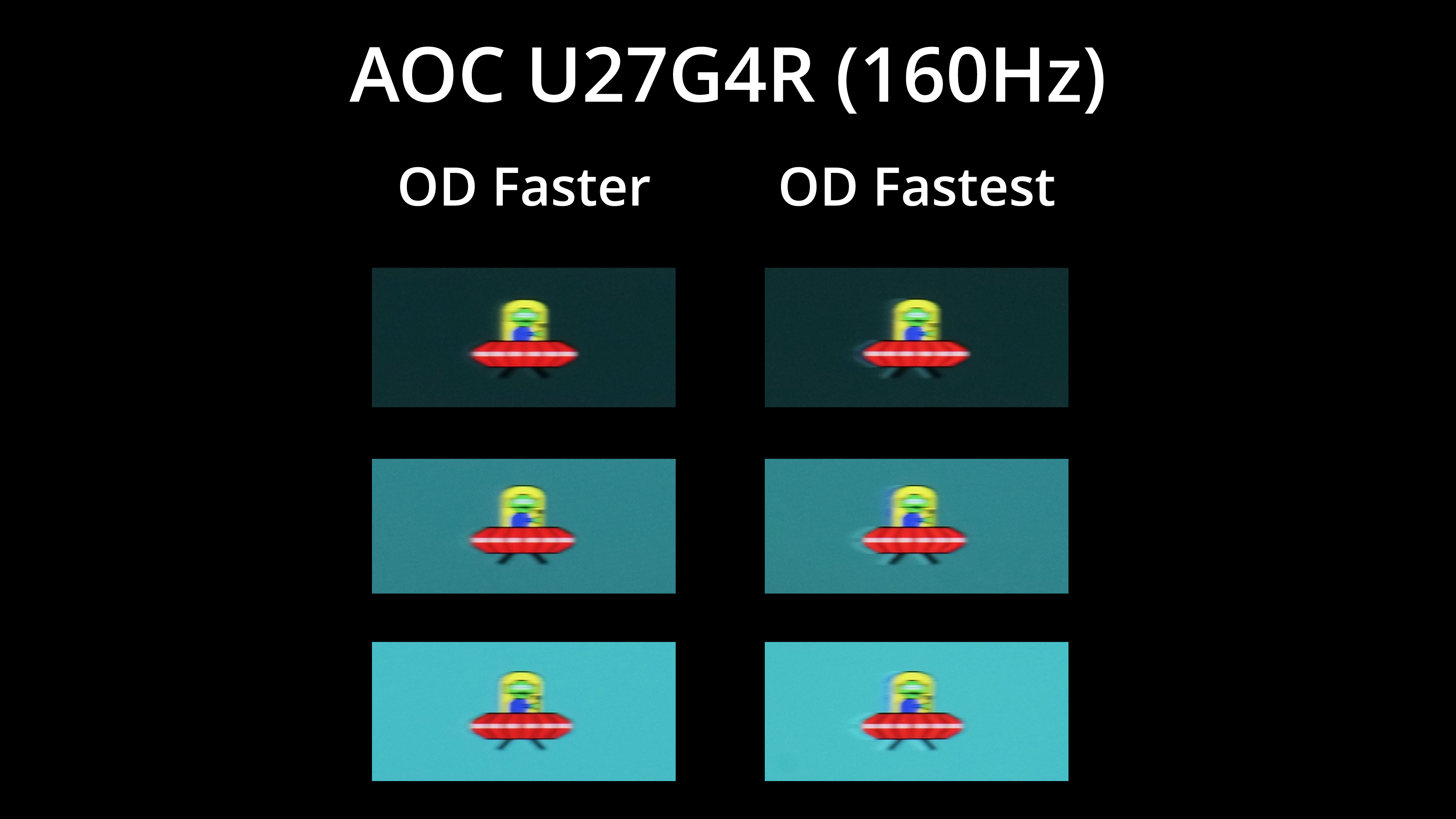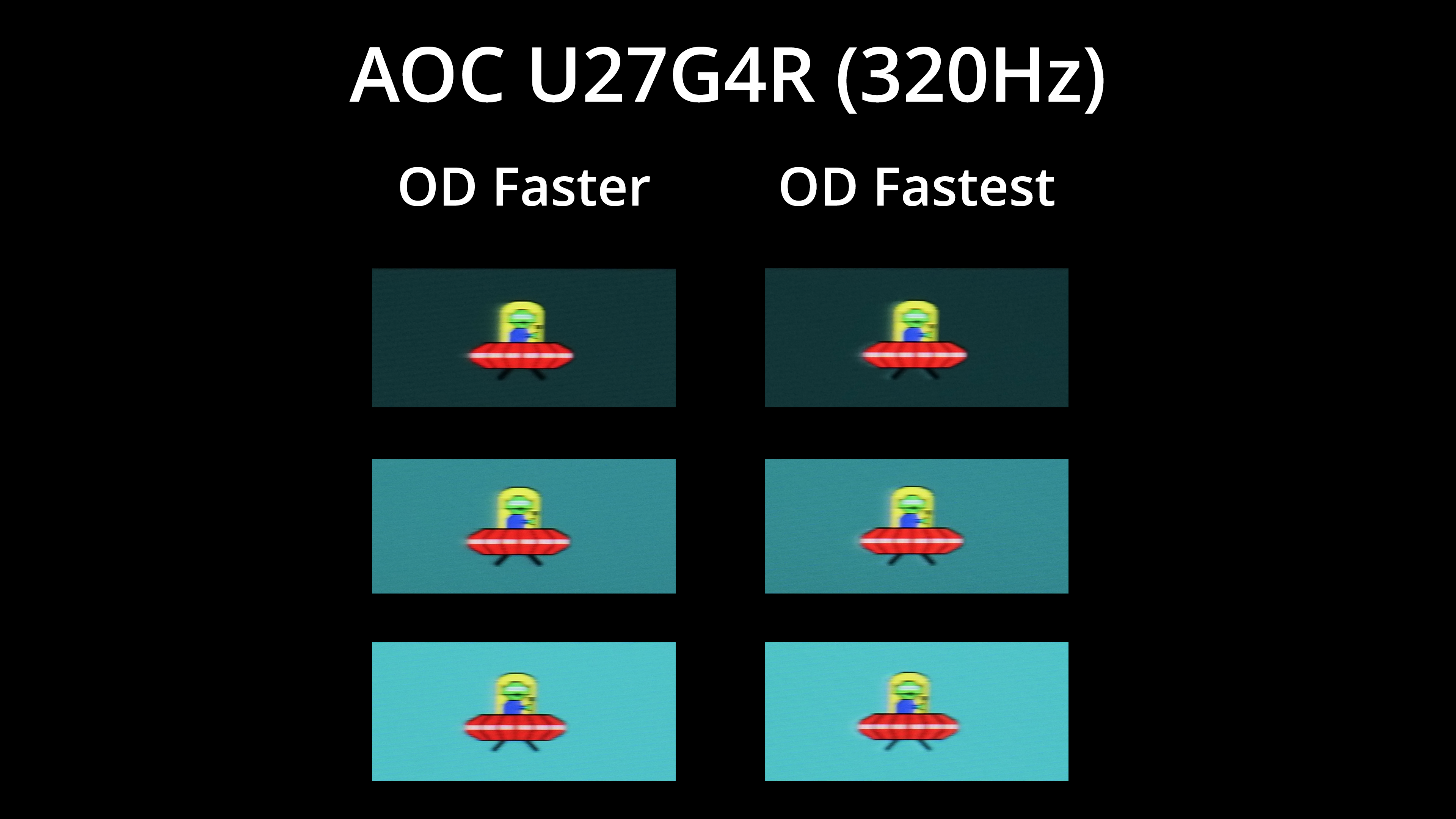 The AOC U27G4R offers a total of four overdrive modes – normal, fast, faster, and fastest. To keep things as concise as possible, we're looking at the best three overdrive modes for the 160Hz and 320Hz modes.
