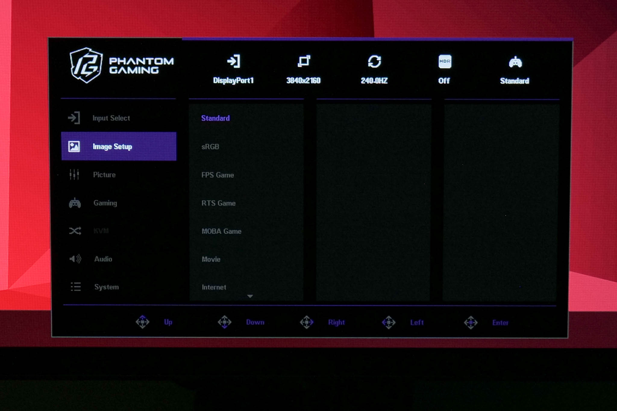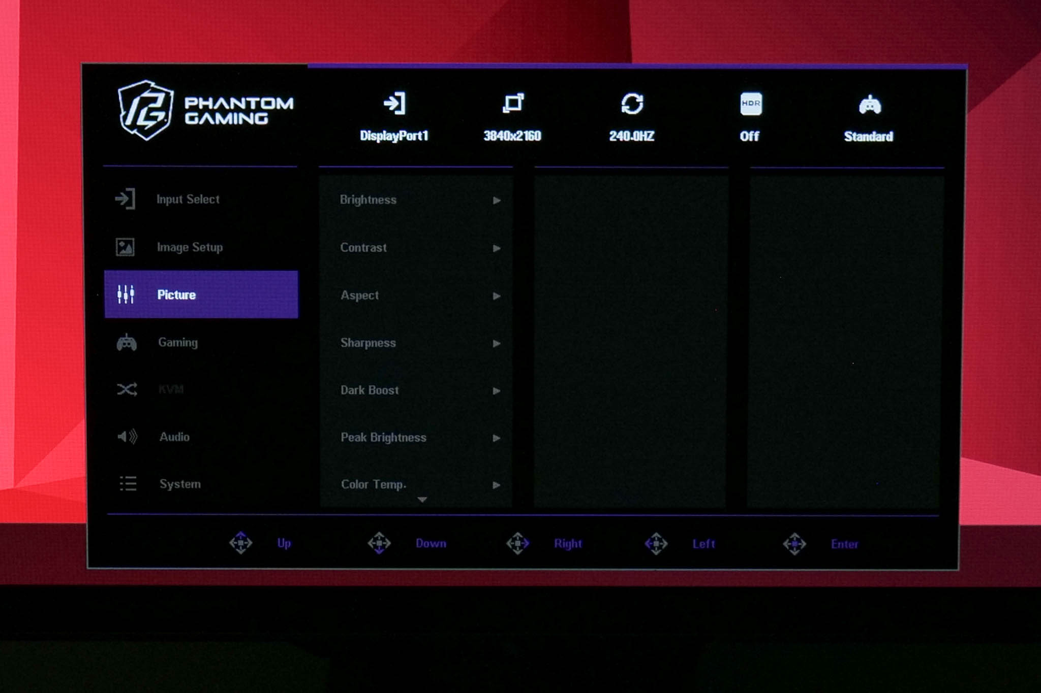 The OSD itself is fine overall, it's very easy to navigate with the joystick and ASRock has included a fair selection of features. That said, I don't like that there's no way to customise quick shortcuts via the joystick, and there's a worryingly small amount of anti-burn in features too. Some of the settings are also slightly confusing, given there's an sRGB mode in ‘Image Setup', but it doesn't actually clamp the gamut unless you also adjust the ‘Color Space' option which is found in the ‘Picture' sub-menu. I think you can tell ASRock is still relatively new to the monitor space as there is room for streamlining here.