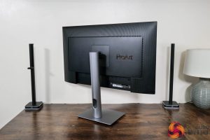 Round the back, the rear is mostly matte black plastic, but with some textured design elements which add visual interest. The ProArt logo is also positioned to the right of the stand. ASUS has also opted for a compact rectangular foot, and this measures approximately 22.7cm across and 18.9cm deep, so it doesn't take up much room at all.