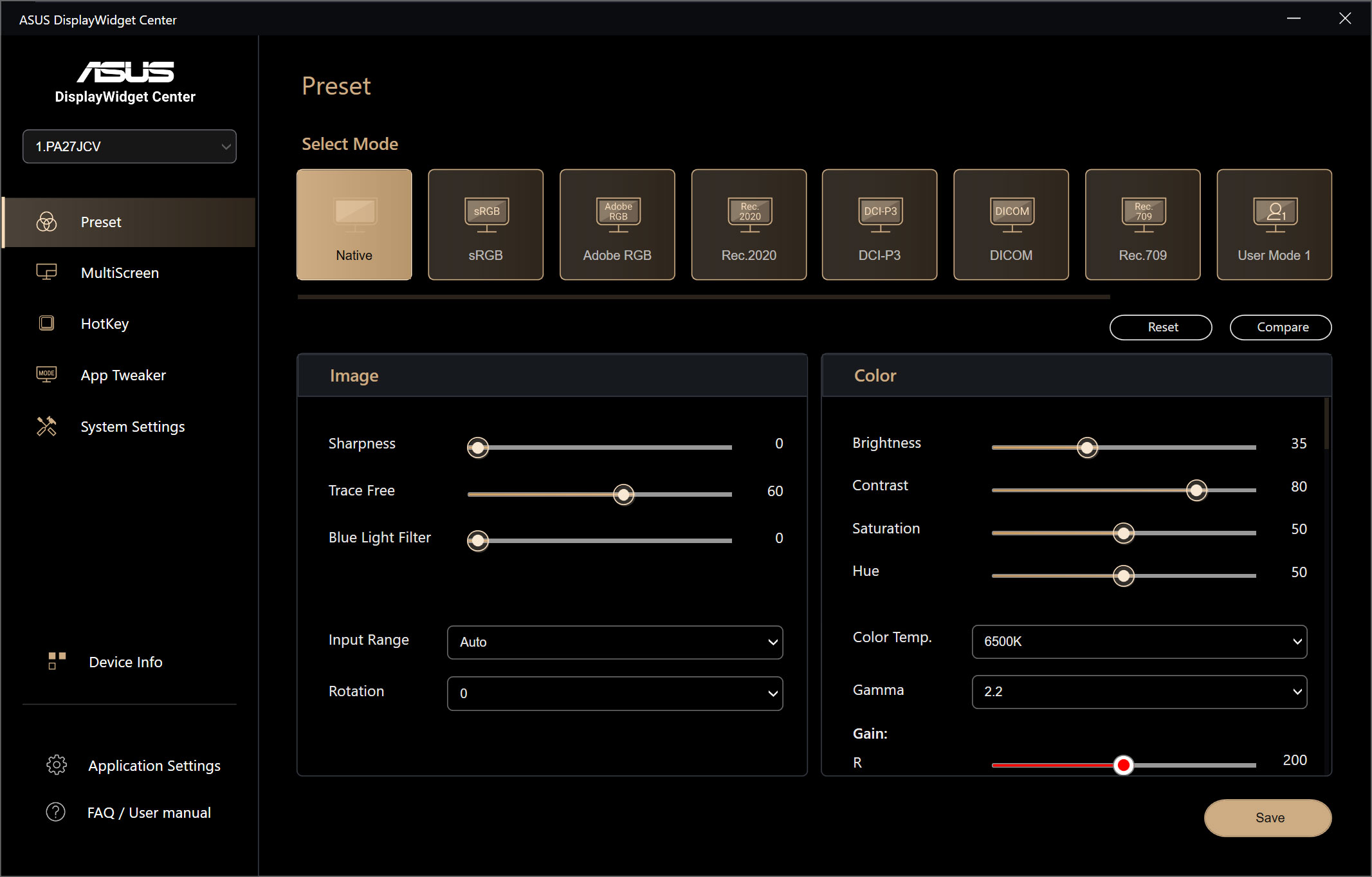 Then there are the Image settings, which includes sharpness, Trace Free (ASUS' term for overdrive), aspect ratio adjustment, input range control, alongside a blue light filter.