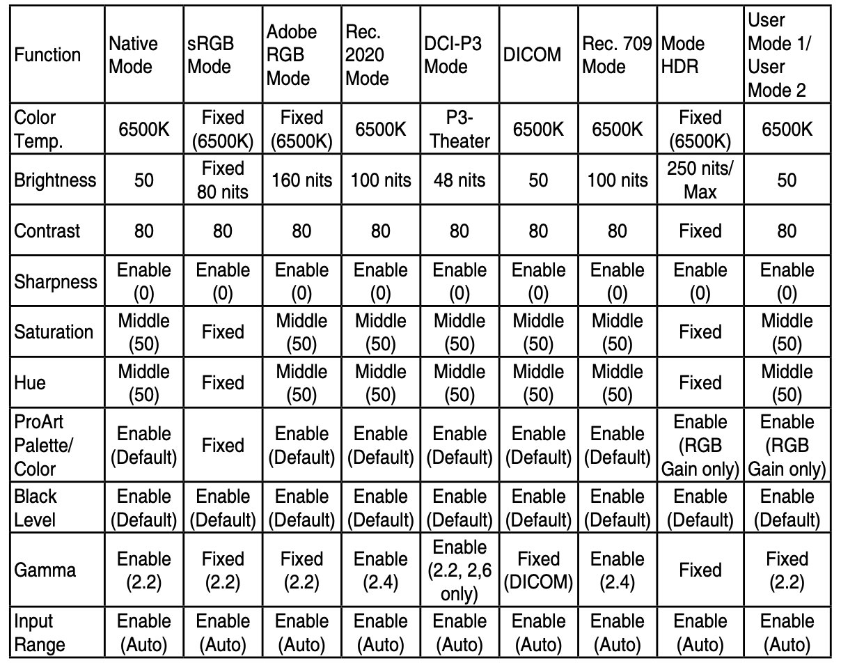 Above is a screenshot from the PA27JCV manual which outlines the exact settings used for each of the colour space modes.