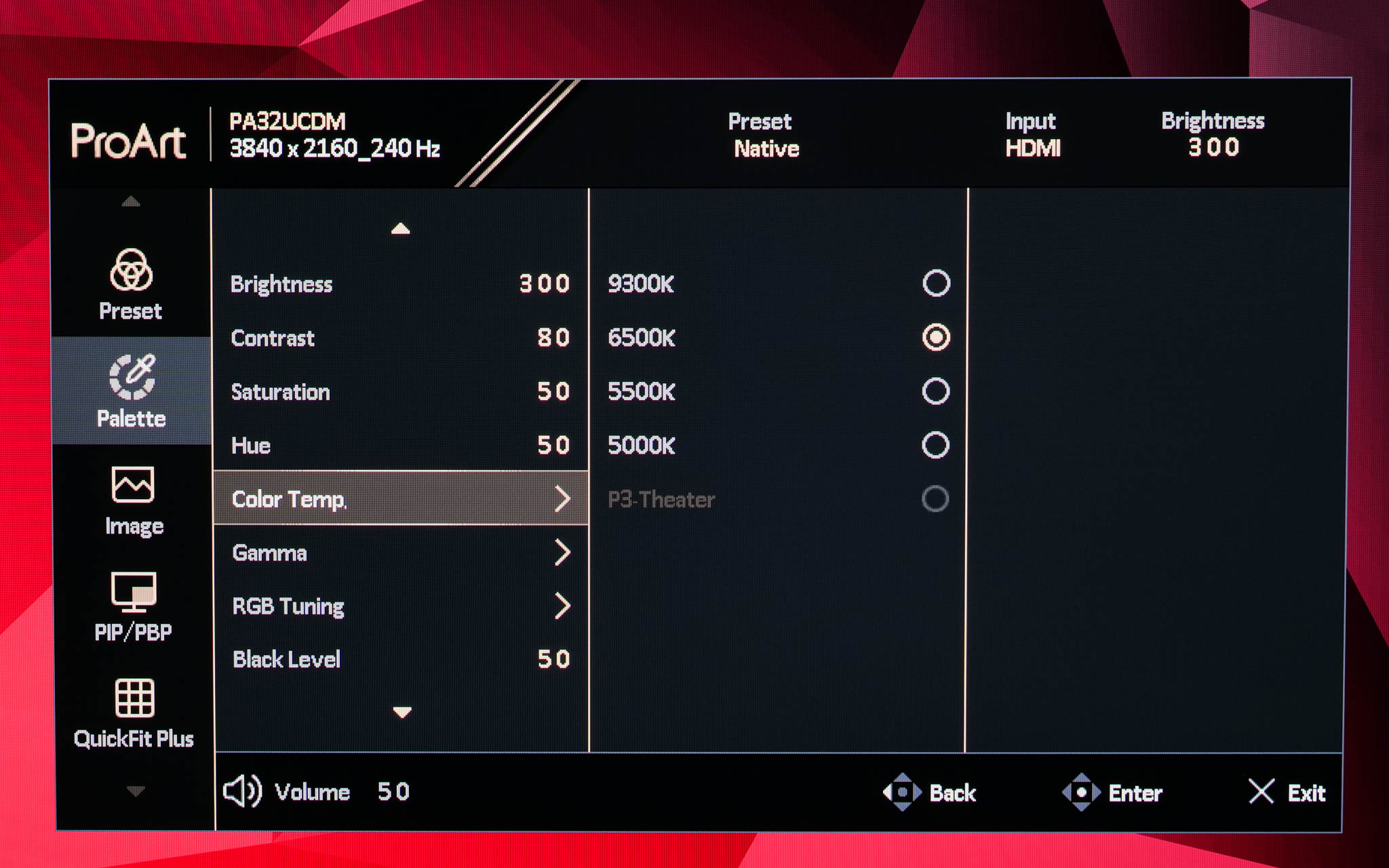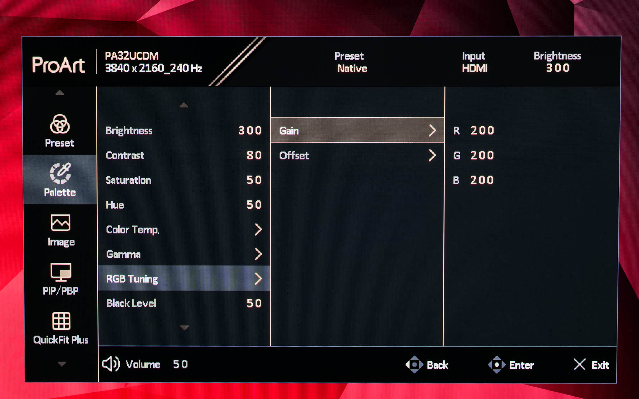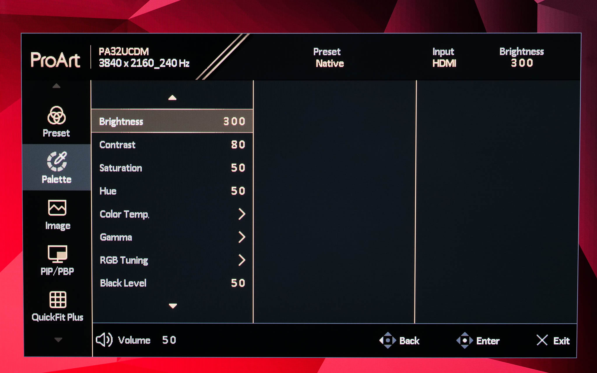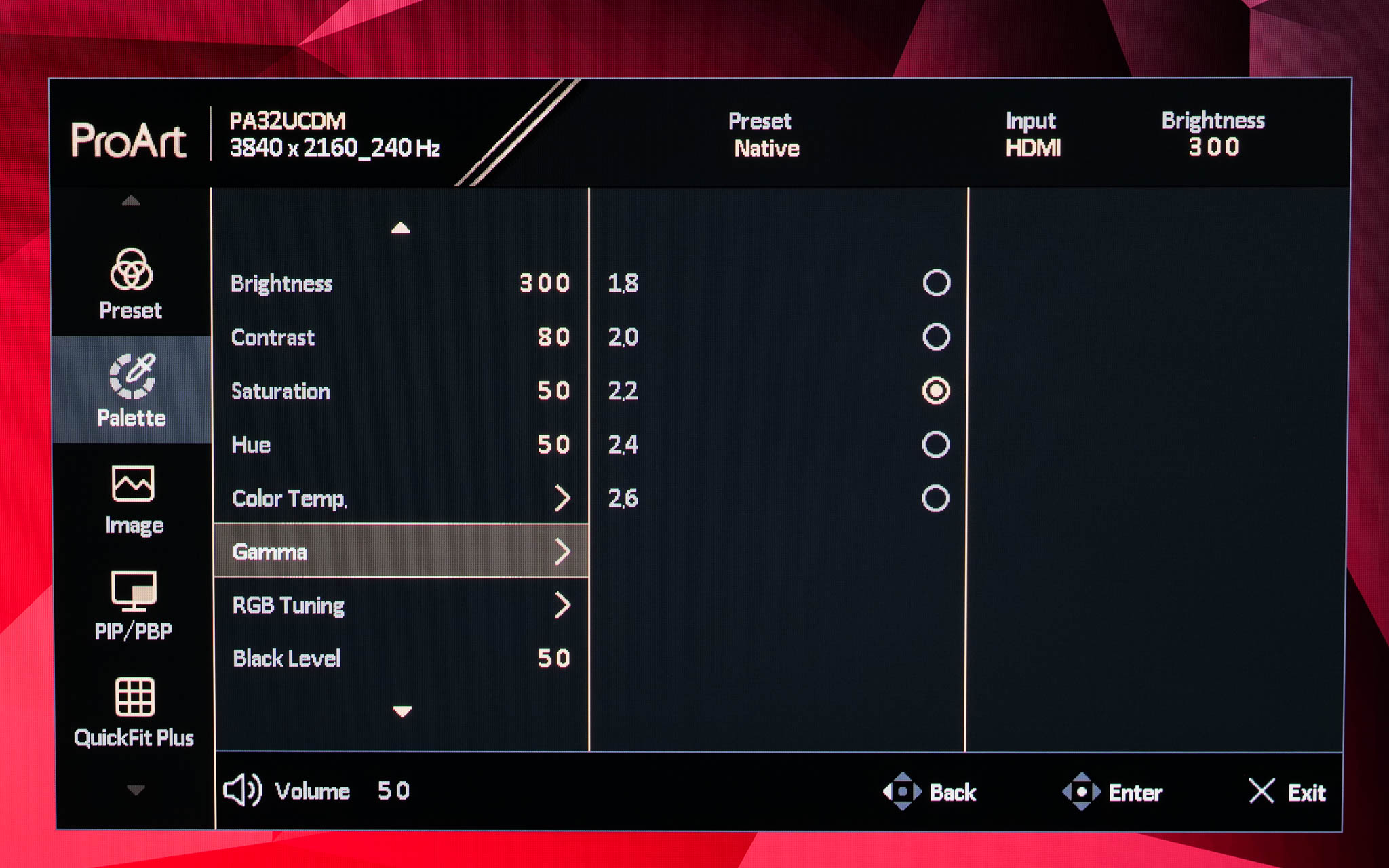 The next tab is called Palette, offering control over brightness and contrast, alongside gamma and RGB controls to manually adjust the colour balance.
