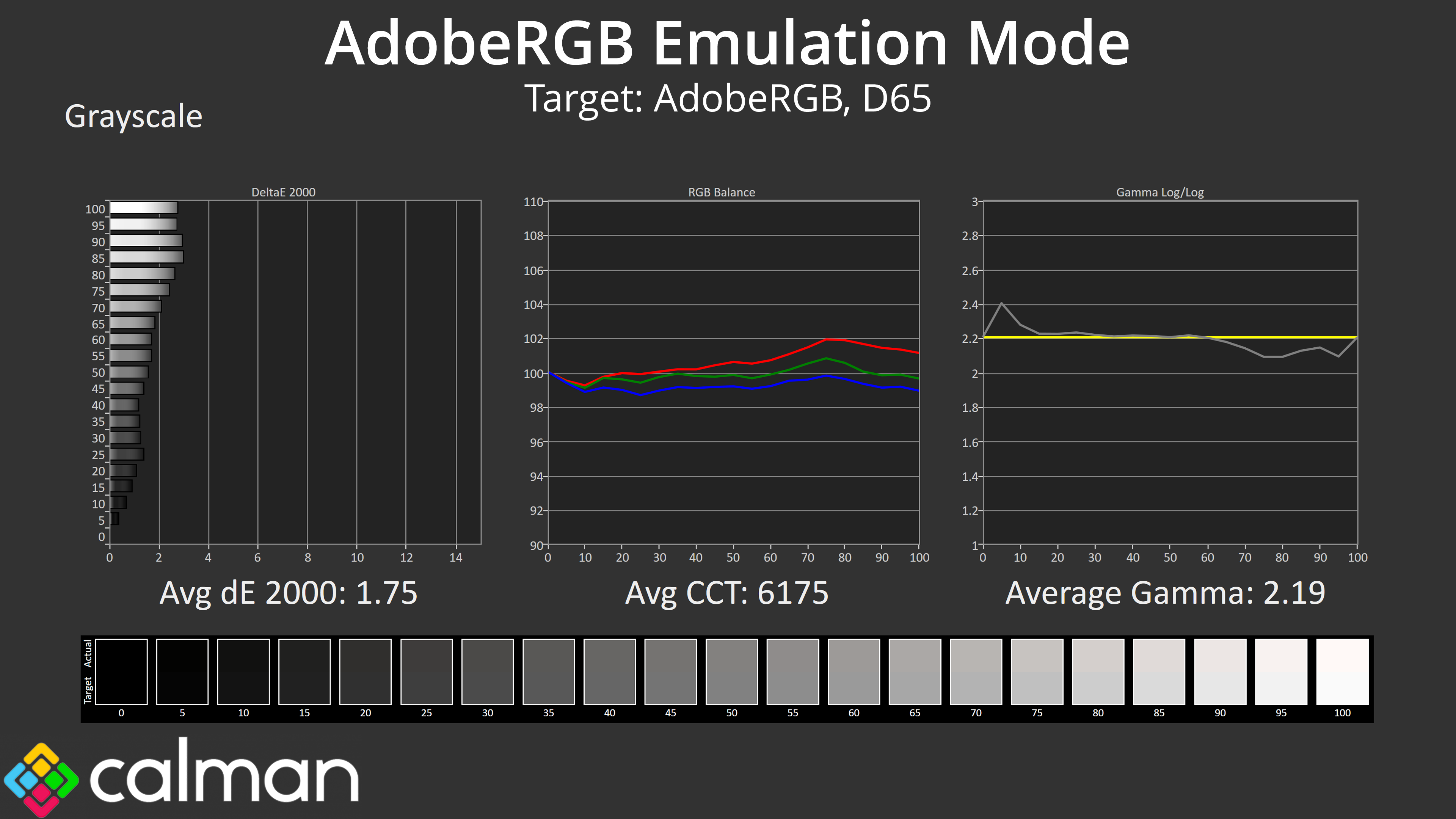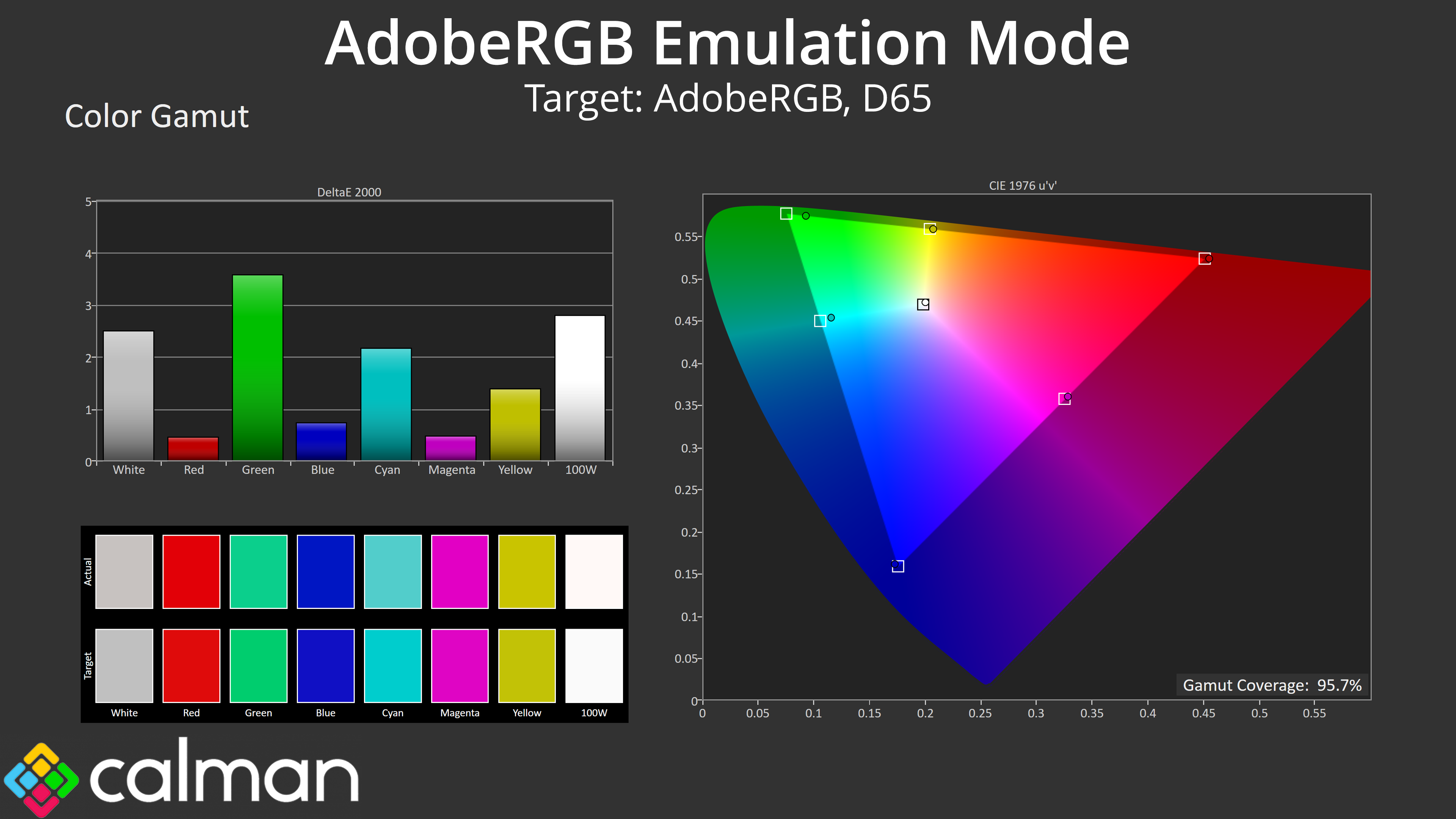 It is the AdobeRGB mode that I found to be the most impressive, however. This does improve gamma performance and it is much more accurate to the 2.2 target, while the gamut is clamped effectively. The panel can't quite reach full coverage though, resulting in small errors in the cyan and green channels, but the average results are still highly impressive.