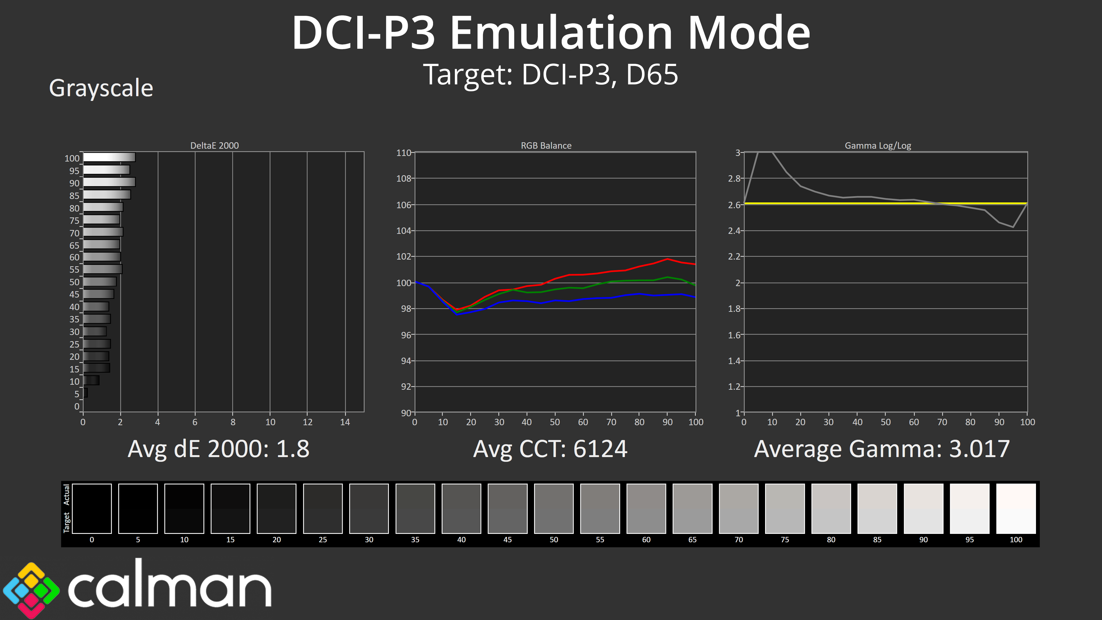 That said, colour accuracy is better for the DCI-P3 space, with an average dE 2000 of 2.28, with the 100% red channel being the worst offender.