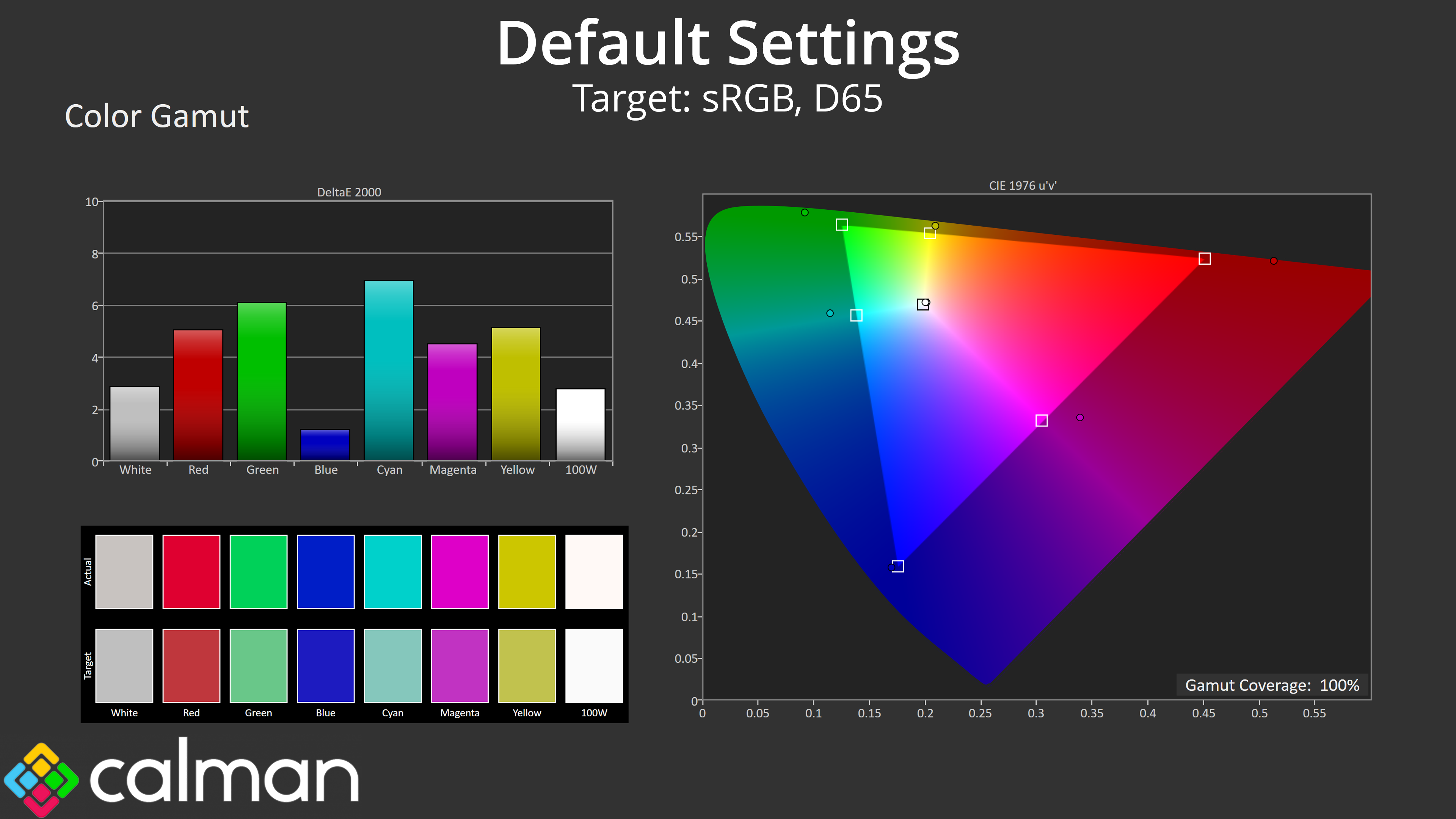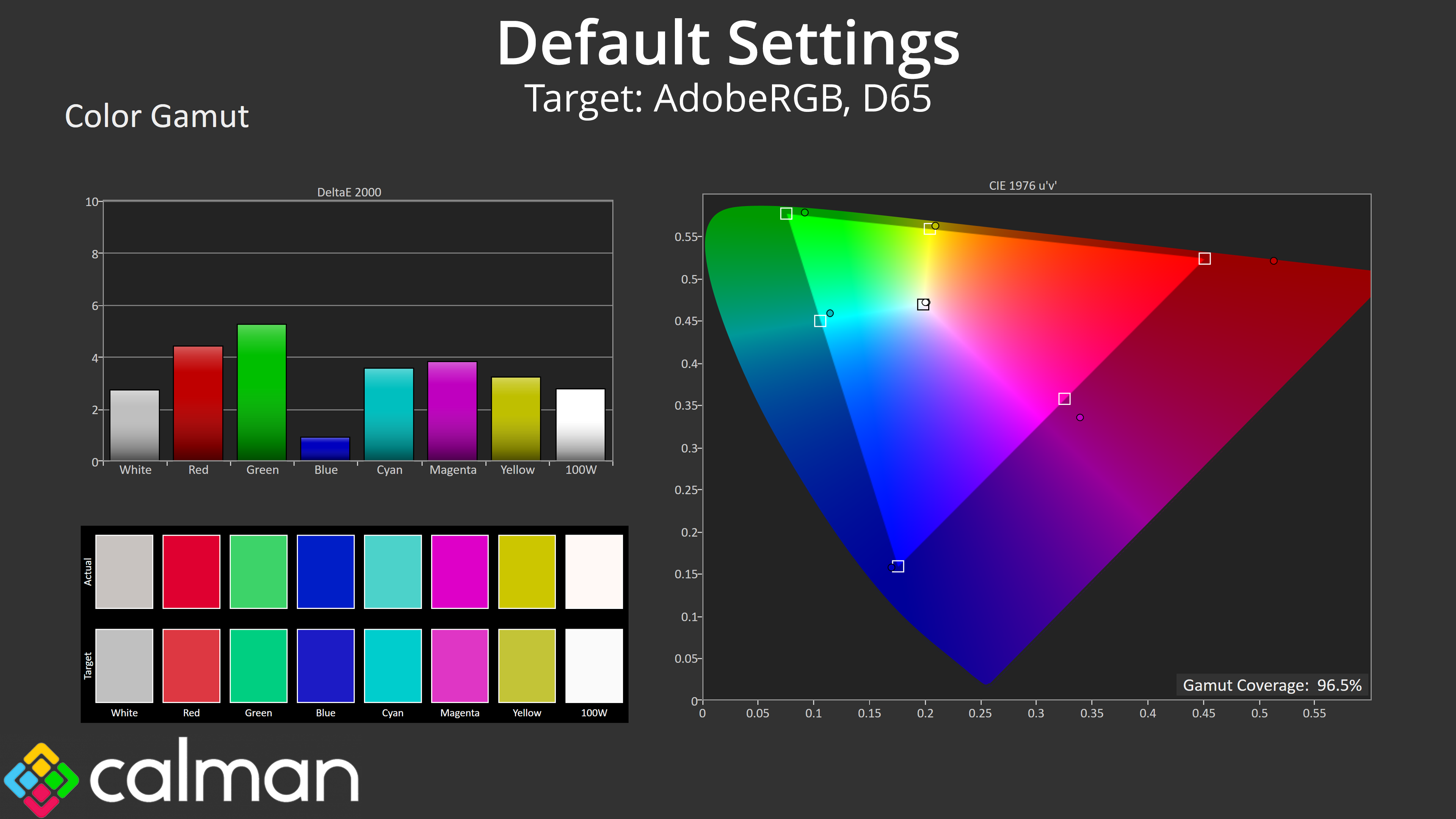 We first run these tests with the display in its out-of-the-box state, with all settings on default. If there is an sRGB emulation option or other useful mode then we may test that too. We then calibrate the screen using the Calman Ultimate software and run the tests again.