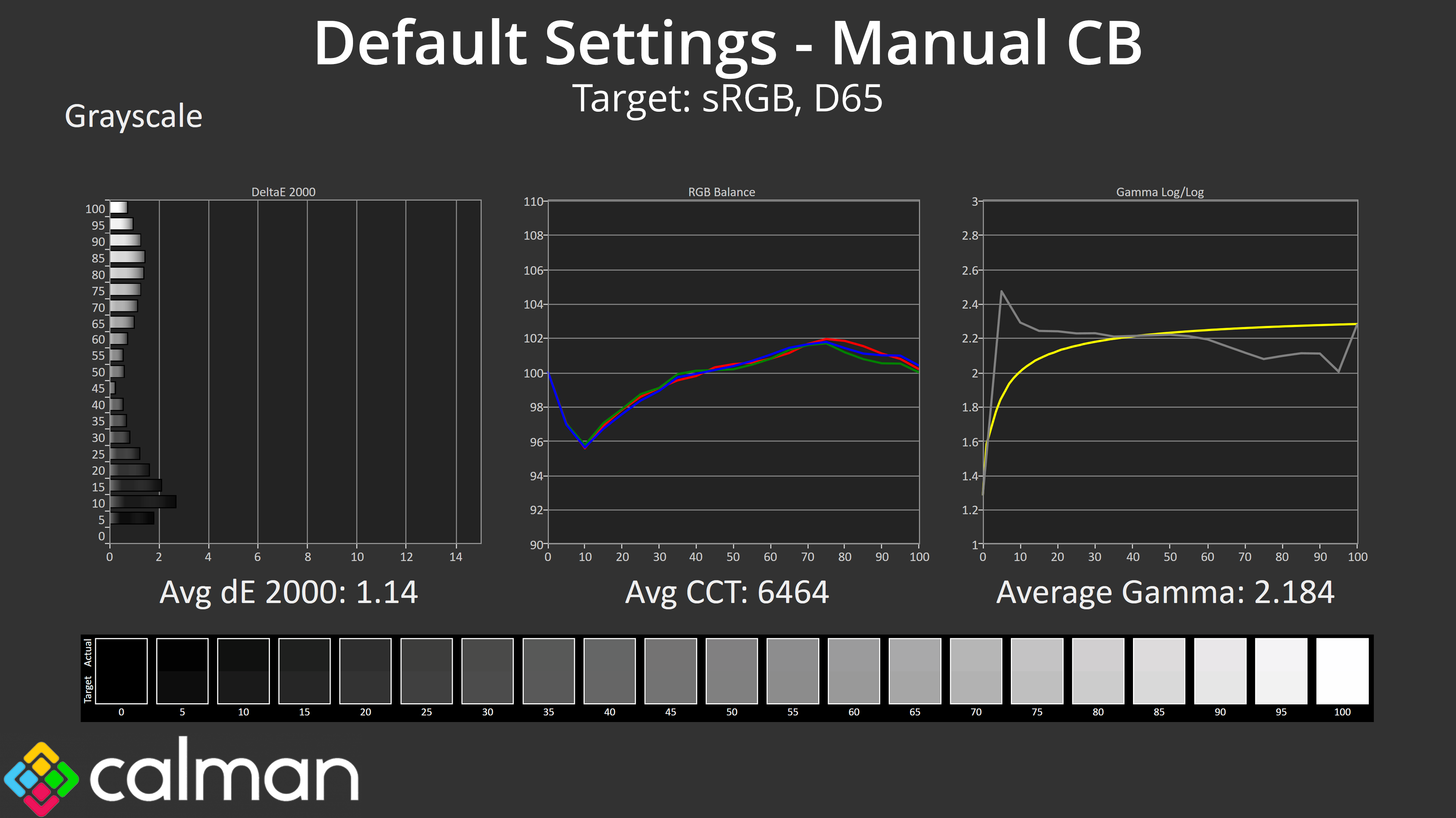Just to illustrate the point about colour balance, with just two simple tweaks in the OSD I was able to improve colour balance significantly. By simply reducing the Red channel gain to 185 and the Green channel gain to 192, I achieved an average CCT of 6464K – basically perfect, and that helped improve the average greyscale deltaE to 1.14.