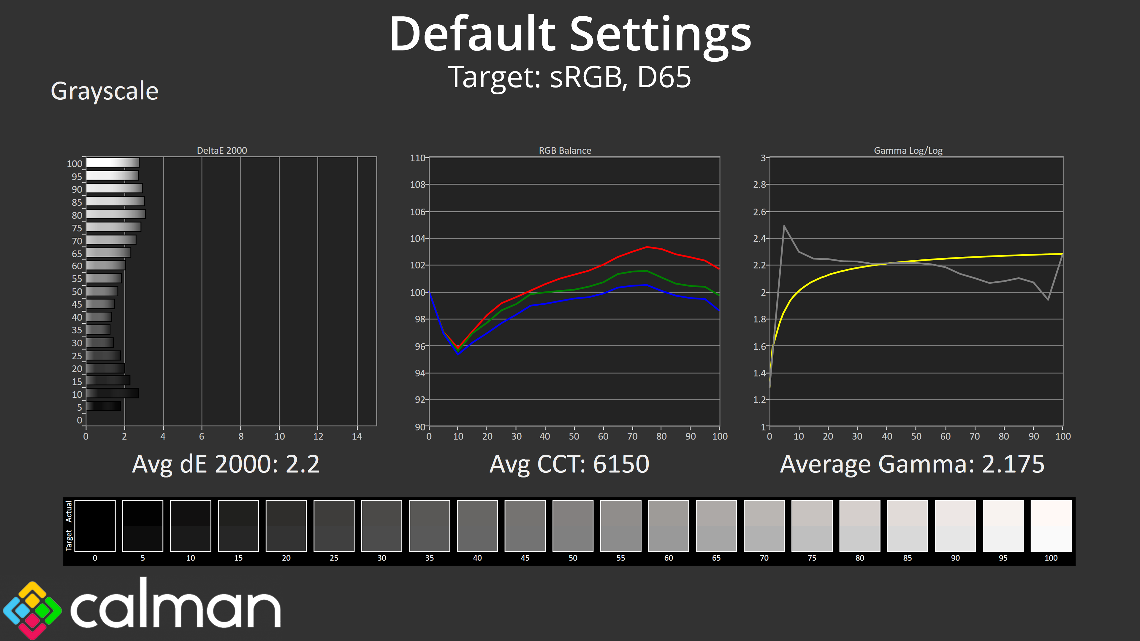 - Greyscale accuracy, measured across 20 shades, with an average colour balance reported.
