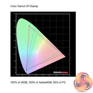 Firing up the Spyder X to calibrate the screen, not much changes at all in terms of gamut, brightness or gamma. Colour accuracy sees a very small improvement however, with a new average deltaE of 0.55 – though I am not sure you would notice the difference between this and the uncalibrated state!