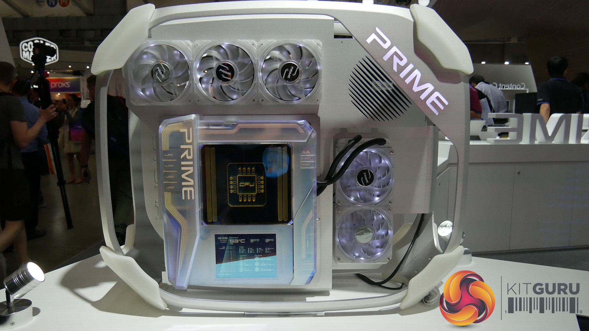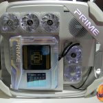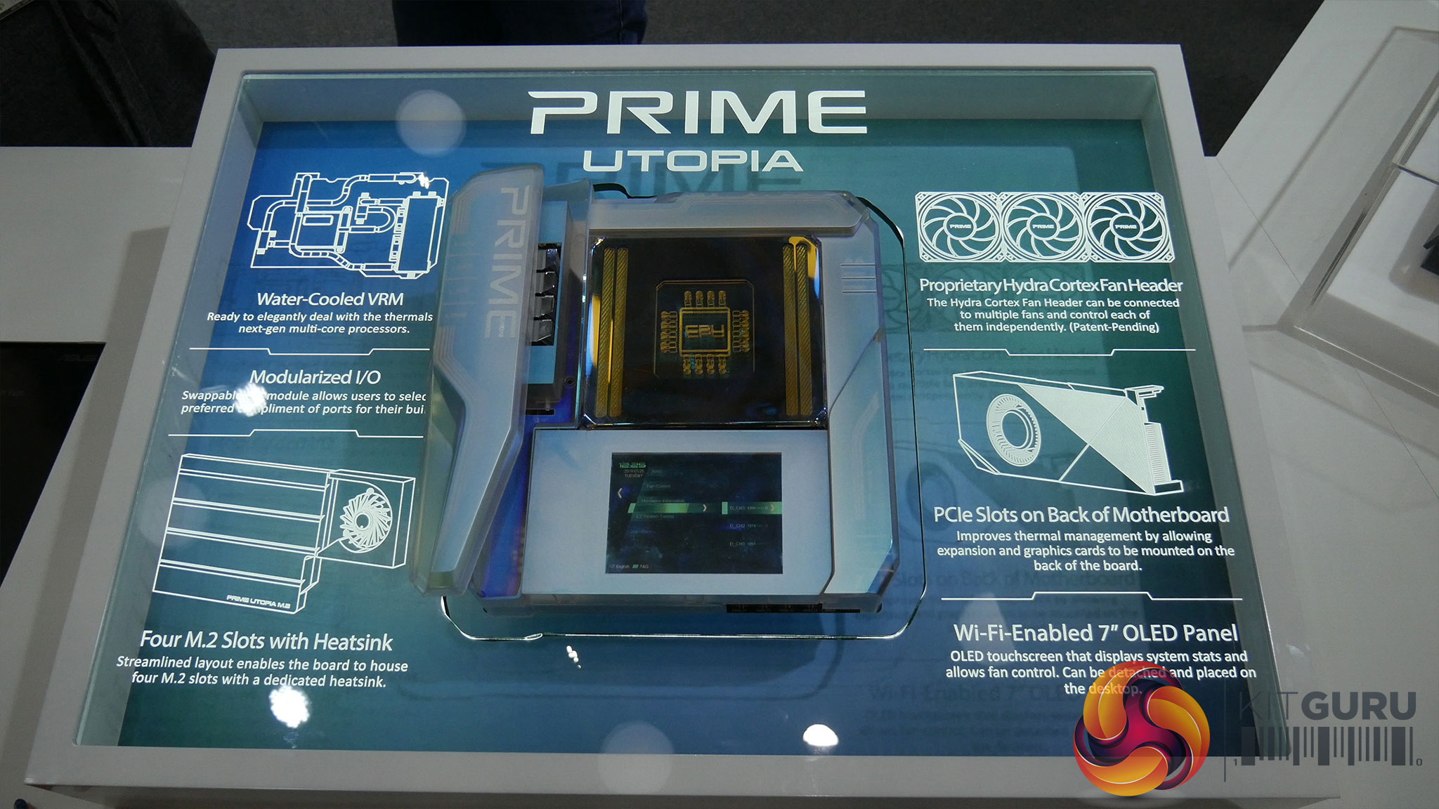 Sticking with the ASUS Prime theme for now, the Prime Utopia concept is definitely quite eye-catching. It's only a concept at the moment – meaning none of it is actually guaranteed to come to the market, but ASUS is trying something a bit different with this idea. For instance, the entire motherboard itself was covered with some translucent plating, with a holographic CPU overlay at the top and a 7in OLED screen at the bottom. The motherboard I/O panel is also modular, meaning you can swap out different ports and put new ones in depending on your needs. The modules themselves do take up more room than otherwise, but it's an interesting idea.