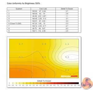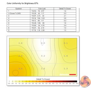 Colour uniformity is also solid. There's some deviation towards the bottom left corner of the panel, but this is fairly minor and gets even less pronounced at lower brightness levels. I typically used this display with brightness set to 75%.