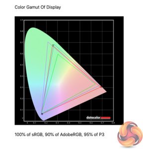 Starting with the colour gamut performance, we can see the GM34-CWQ delivers 100% sRGB, 92% AdobeRGB and 95% DCI-P3 coverage. It's an impressive start for a gaming screen.