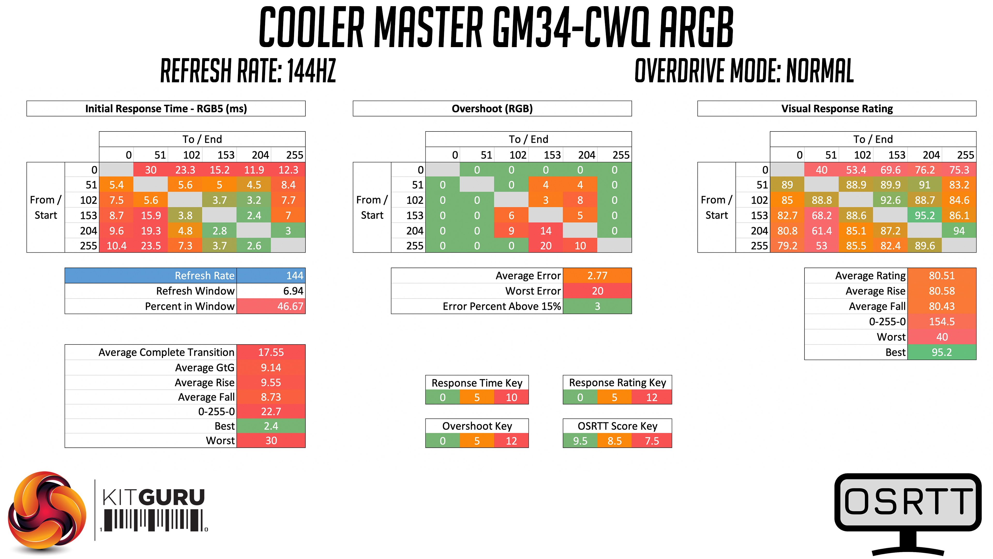 Monitor response time testing is a new addition to our reviews, where we use the Open Source Response Time Tool (OSRTT), developed by TechTeamGB. This measures grey-to-grey response times and presents the results in a series of heatmaps, the style of which you may be familiar with from other reviews.