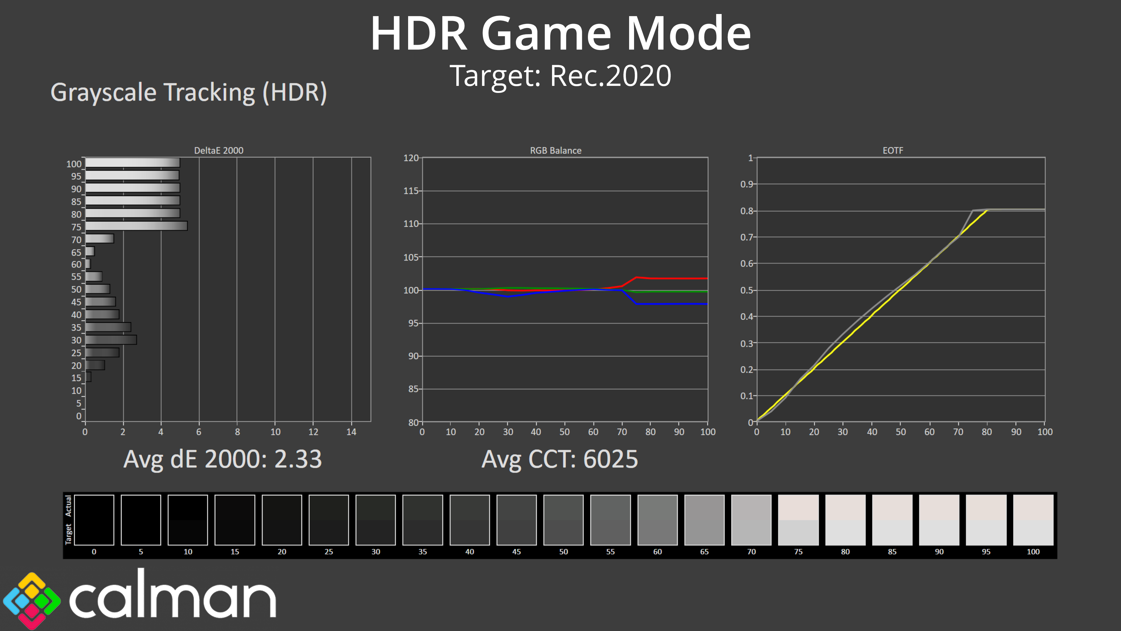 Either way, HDR accuracy is decent. You may have seen some previous reviews of the GP2711 that demonstrated very dark EOTF tracking, but with the latest firmware (V1.05) I am pleased to say this is now fixed and EOTF is generally accurate, being just a touch too bright for the lower-mid tones. We do still see a warm overall tint, especially when look at brighter shades, but user colour balance is still an option with HDR enabled.